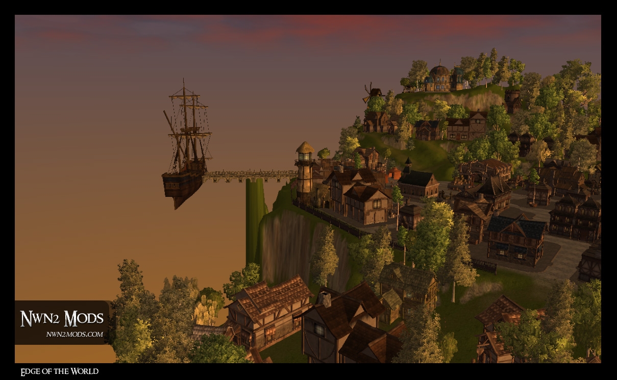 This NWN2 area consists of a town at the edge of a cliff that doesn't seem to have a bottom. This town contains rural homes, merchant quarters and other homes located on 3 teirs of land overwhich looks a large temple atop the tallest hill. This mod has a fully functional walkmesh.