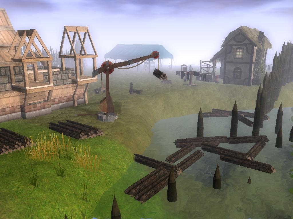 The treestumps all have the same orientation and size. The texturing inside the camp is bland and unrealistic, there would be paths that are more frequently walked than others mainly to the points of work and the gate. The loading area needs some kind of supporting feature like a dock that goes into the water or a more gentle slope also a more sturdy foundation for the crane.