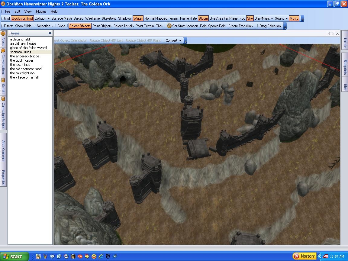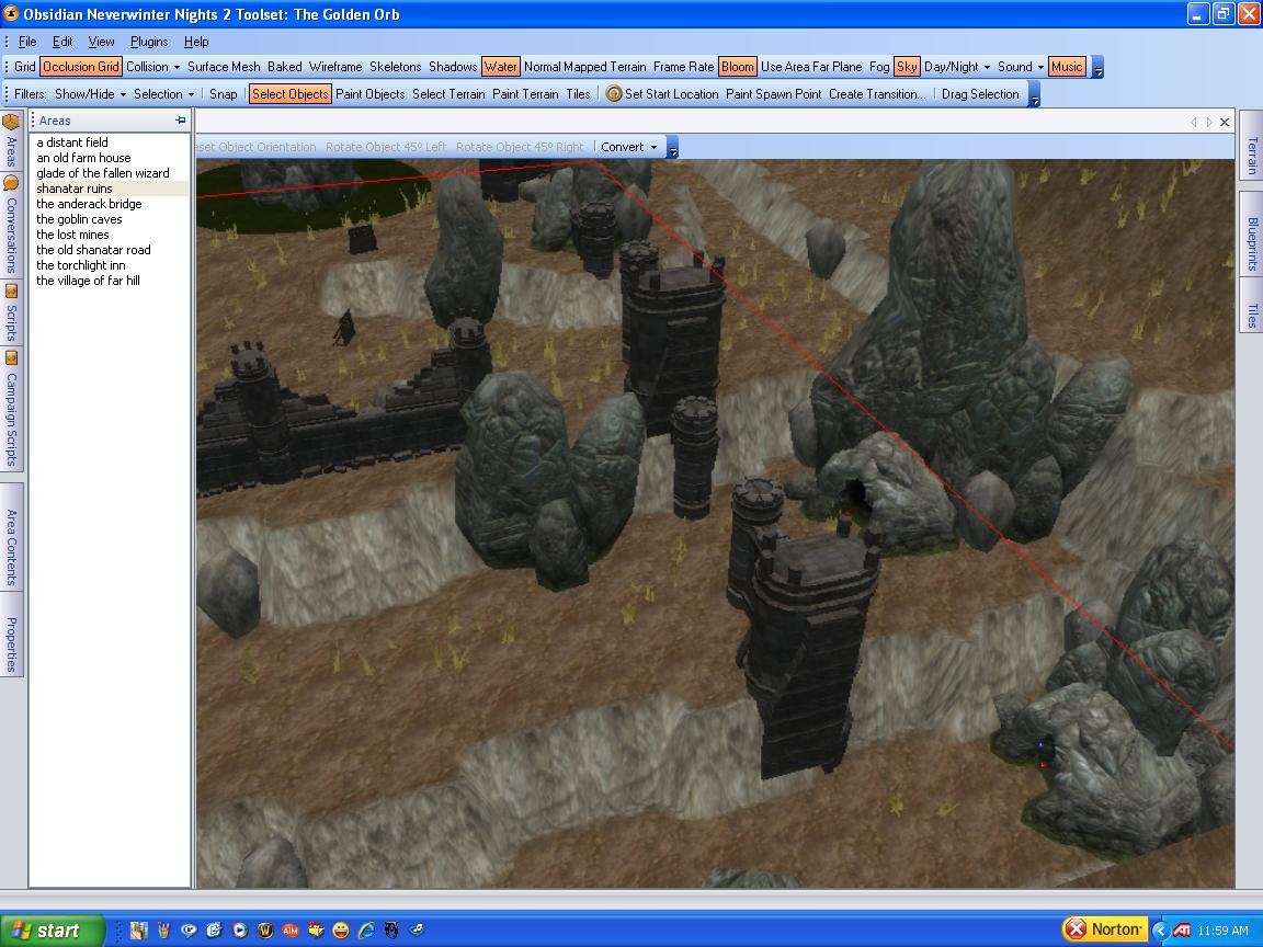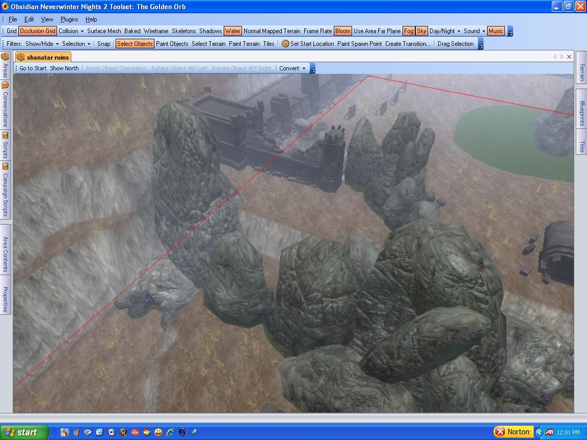 This is the exterior of a great ruined fortress, once a part of High Shanatar but now forlorn and monster infested. These ruins are stair stepped, but the only way to reach the top is to go through caves crawling with evil! This is only the exterior, the interiors are left out so that you can fill them content appropriate to your module. The Ruins include defensible positions that are designed to make it tough for players to reach the top. Again, these ruins lack interiors and sounds, there are placeables and grass and everything else needed to make the area look forboding.