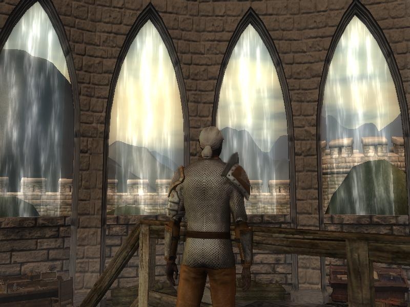 Thanks for the compliment! The concept behind the waterfalls was the thought that the Water Baron was obsessed with using water in unusual ways. And, one way that came to mind was: what if he had hidden pipes within the walls and ceiling... to pump out water from some hidden source beneath the keep... and then into the moat that is surrounding the castle itself, for the purpose of maintaining the moat and creating this view of waterfalls whenever you look outside the windows of the main hall itself? As to why the moat would need fresh water pumped into it, I further envisioned the idea that... somewhere below the water's surface it drains to an underground resevoir, which is the place from which the baron purifies the water that he gives to his people.