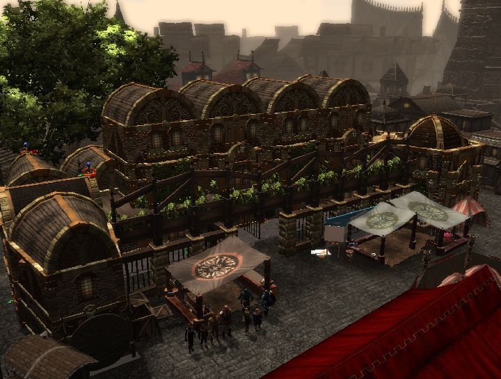 Area 001: Cannoneer's Square is a small specialty marketplace located behind the venerable Iluster College of the Arcane. The district is dotted with warehouses and workshops. A small alleyway lead off to one side of the College's alchemical labs, and onto the well-manicured college grounds. The market plays home to a number of travelling peddlers during the spring, and at present, is the site of a gathering expedition into the mountains, to be led by a small mercenary company camped in the middle of the square. To one side of the largest of the red tents is a grimy alleyway by which is reached a set of stairs, that lead up the mouldering ramparts to a quiet overlook, often frequented by city guards. Down the opposite stairs one comes to a locked grate through which lies access to the city's ancient, overgrown aqueducts.