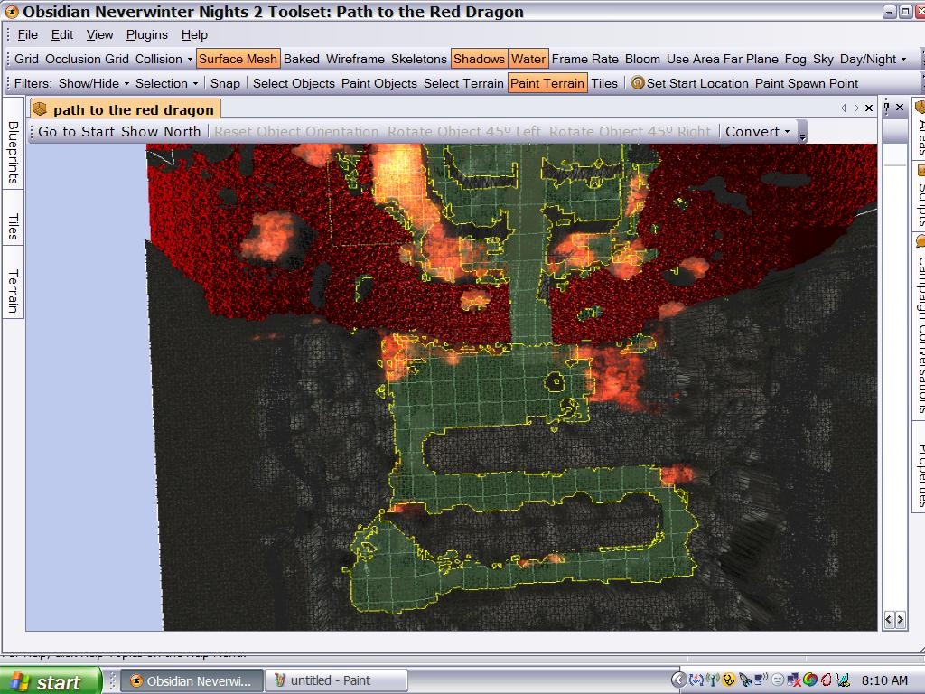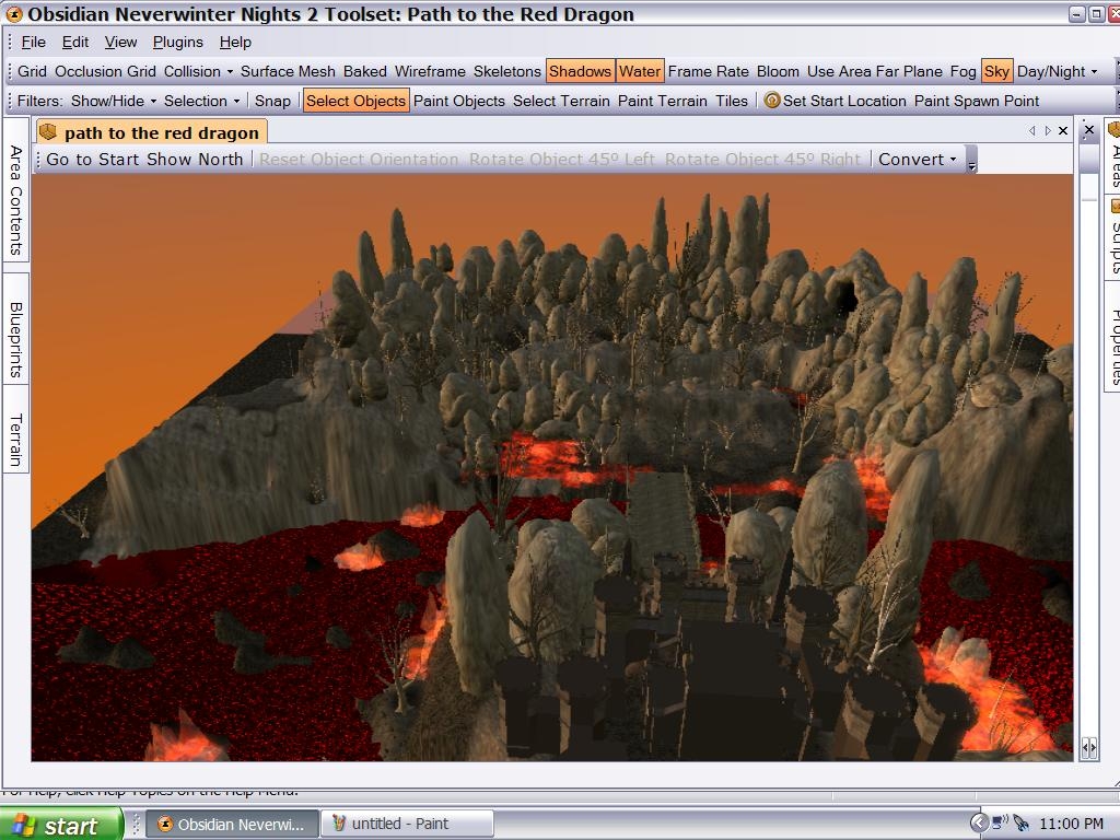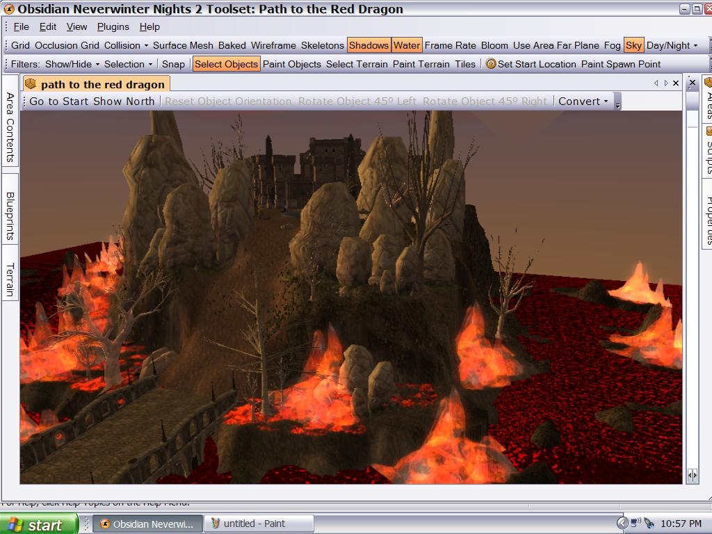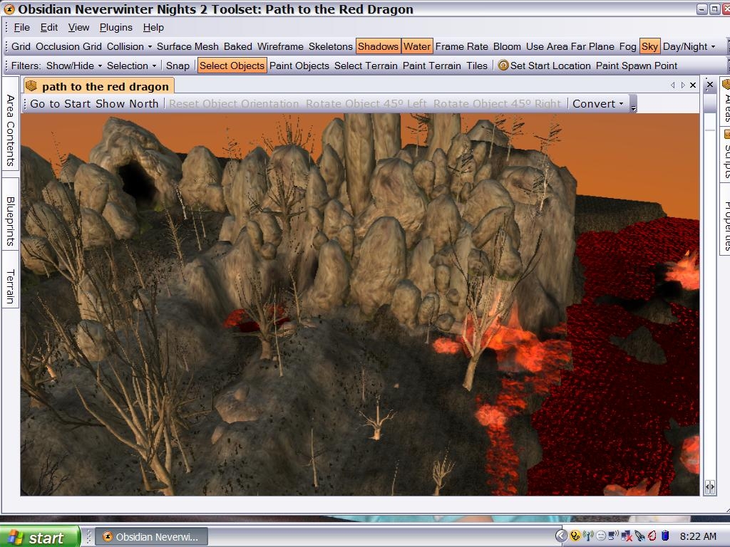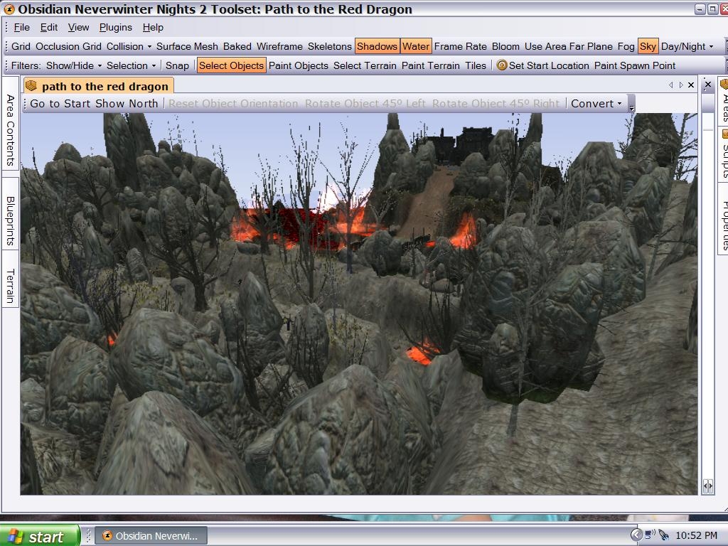 This is a winding path to an old castle where an old red dragon now lives. Many warriors have come before and not been able to survive the harsh terrain. Those who do make it will have to face what is to come within the once populated castle. Eventually I may add some effects to this area, and there will be much more added for the mod that I am working with, but this is a pre-fab area and I will let you decide how to challenge the players here. The various cliffs and raised terrain here give certain types of mobs a distinct advantage.