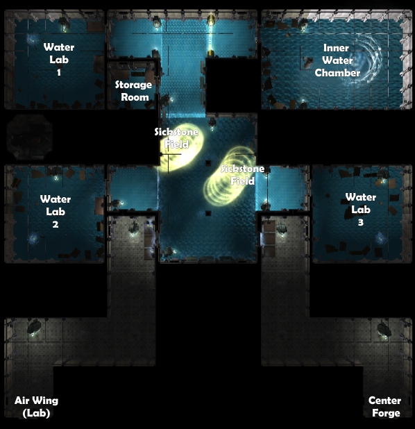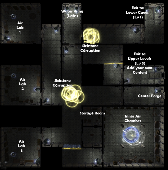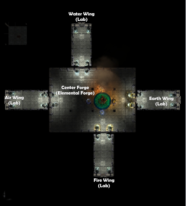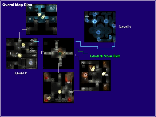 1) Six small areas, each 8x8 layout. With a bunch of small puzzles and one that takes the smaller ones to build the exit key.