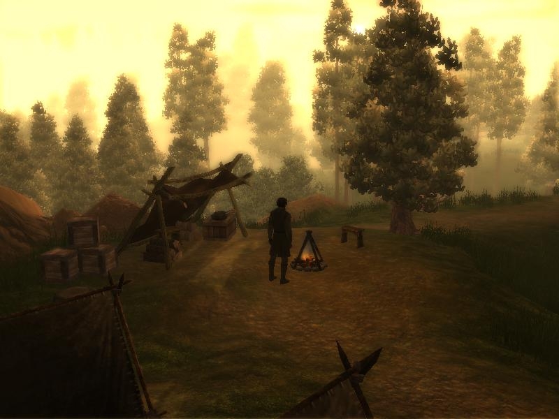 The area needs a bit of work, though. I personally found the sky painfully bright in the daytime. Also, some of the cliff textures were stretched too much. I'd recommend setting the Specular Color of the campfire light to a yellow tone with a bit of orange in it so that highlights will be cast in that color.