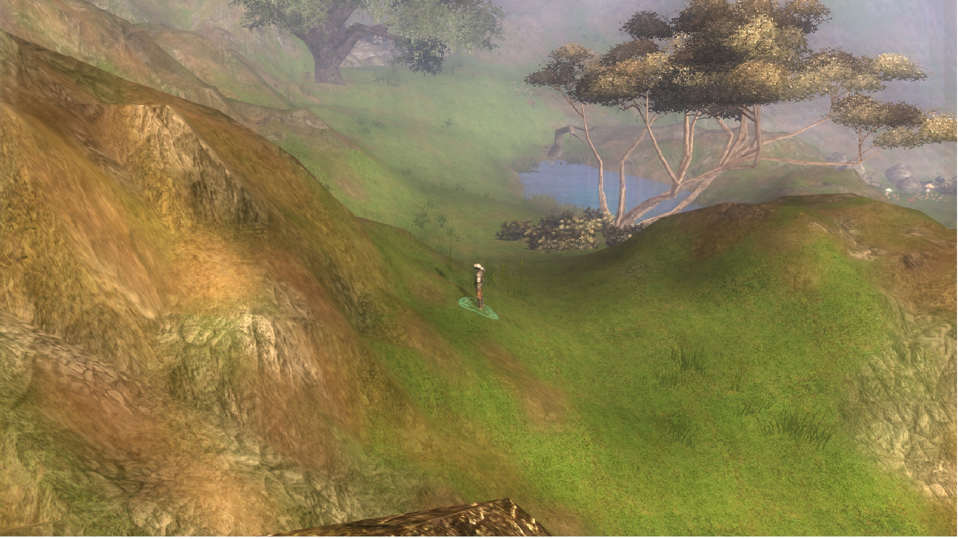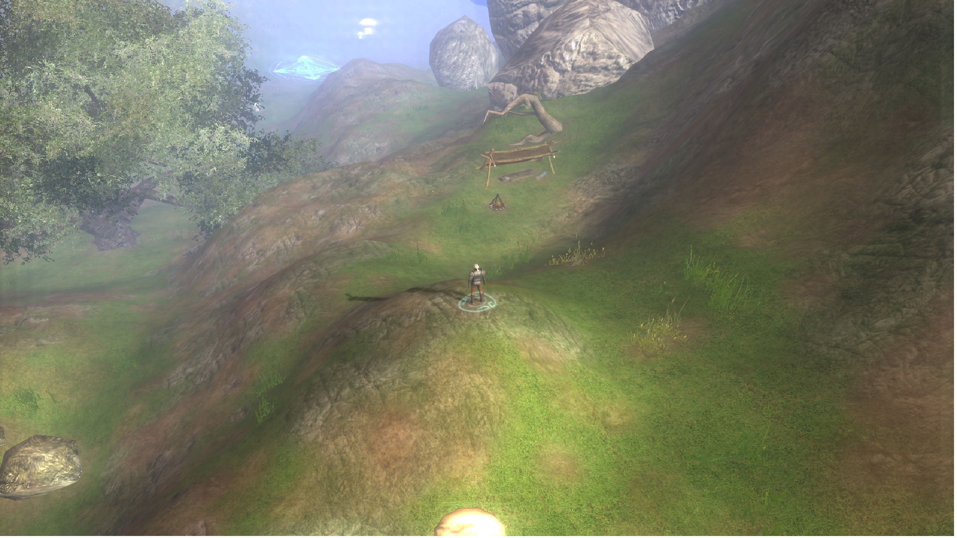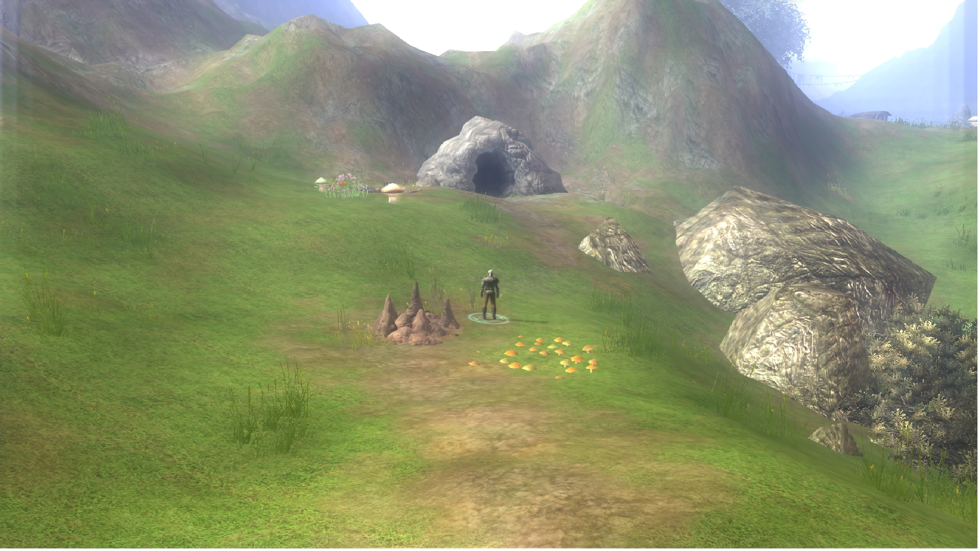 "After an hour's hike, you find yourself in a lush mountainous valley. Tall cliffs surround the area; some jagged, some round and covered in small patches of grass, and dirt. The grass varies in height; browned near the path you walk, but mostly green in other areas. You notice a small camp on a ridge - it looks recently used. After walking up a small incline, you notice a building standing on a larger ridge above you. As you walk from the rocky outcropping, you spot a small pond with crystal-clear water, almost blue. You decide to refill your wine skin with some of the water. There is a cave entrance jutting from a rockface not too far from where you're standing, but you decide against venturing into it due to the faint growls you hear echoing from inside. At the top of the valley, you notice a merchant wagon not too far from the structure you saw earlier, but nobody is around - you think they may have gone into the building..."
