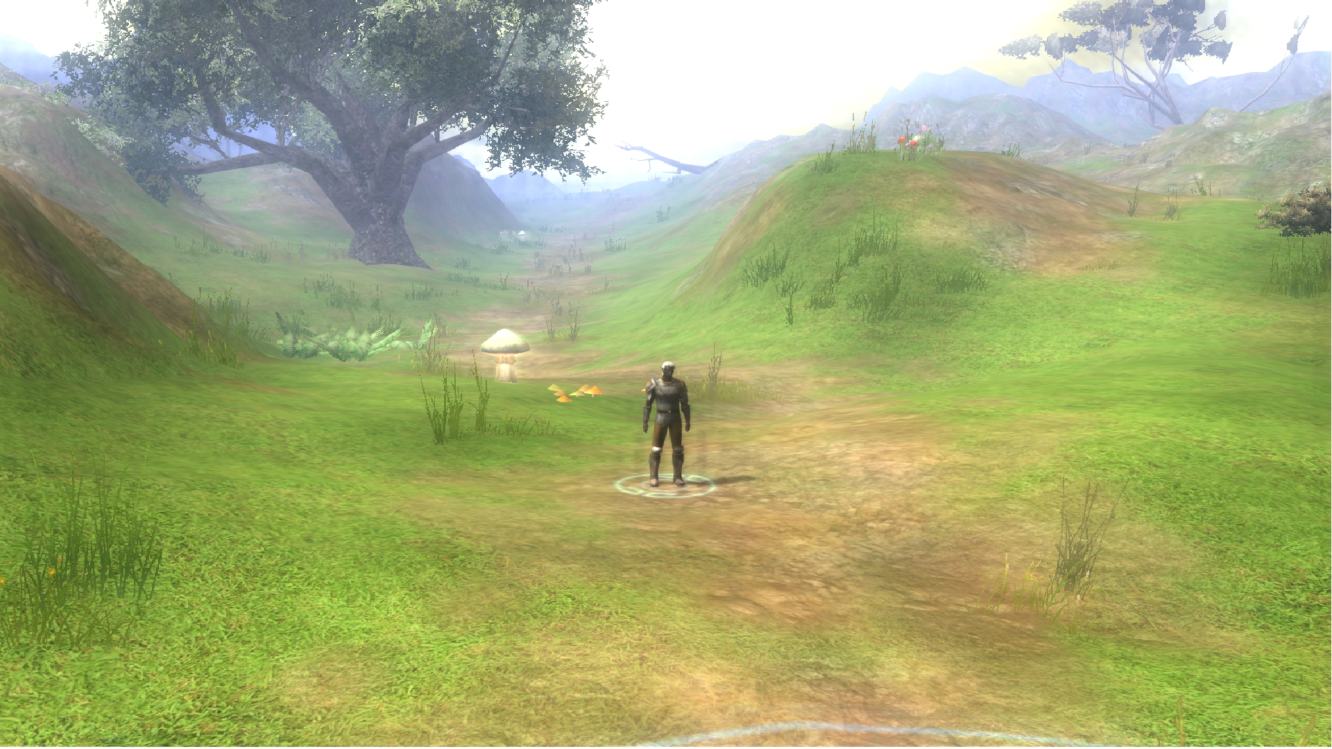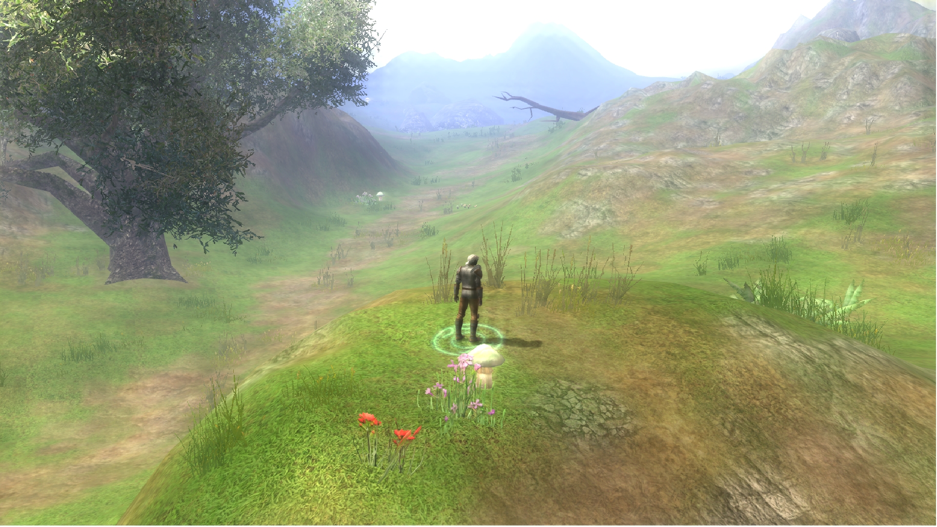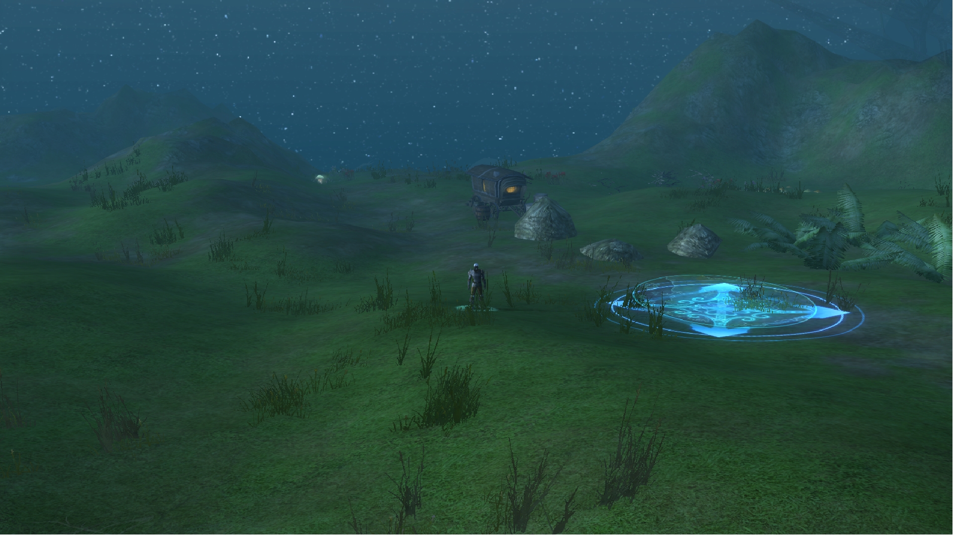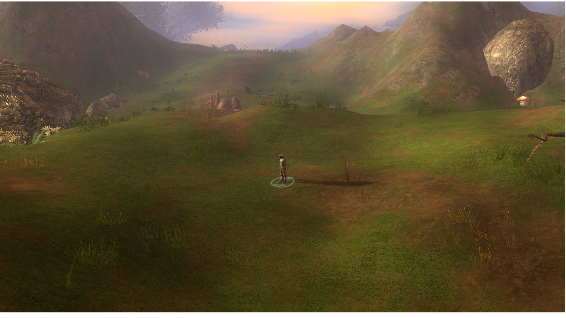 "After an hour's hike, you find yourself in a lush mountainous valley. Tall cliffs surround the area; some jagged, some round and covered in small patches of grass, and dirt. The grass varies in height; browned near the path you walk, but mostly green in other areas. You notice a small camp on a ridge - it looks recently used. After walking up a small incline, you notice a building standing on a larger ridge above you. As you walk from the rocky outcropping, you spot a small pond with crystal-clear water, almost blue. You decide to refill your wine skin with some of the water. There is a cave entrance jutting from a rockface not too far from where you're standing, but you decide against venturing into it due to the faint growls you hear echoing from inside. At the top of the valley, you notice a merchant wagon not too far from the structure you saw earlier, but nobody is around - you think they may have gone into the building..."