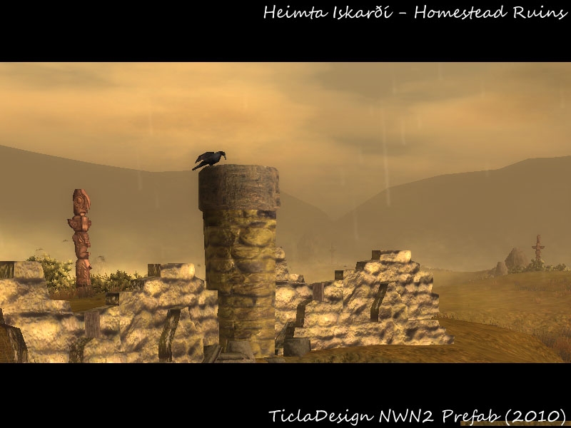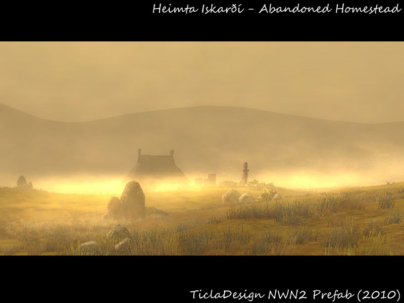 Project/Builder Notes: Heimta Iskardhi south, with an abandoned/deserted Homestead that's becoming a ruins with crumbled walls, unfinished parts and a (main) Building that can be entered. The area itself is a Lowland/mountainous steppe like area where the player can move around on freely. It works very well with large creatures or many NPC's needing to navigate.