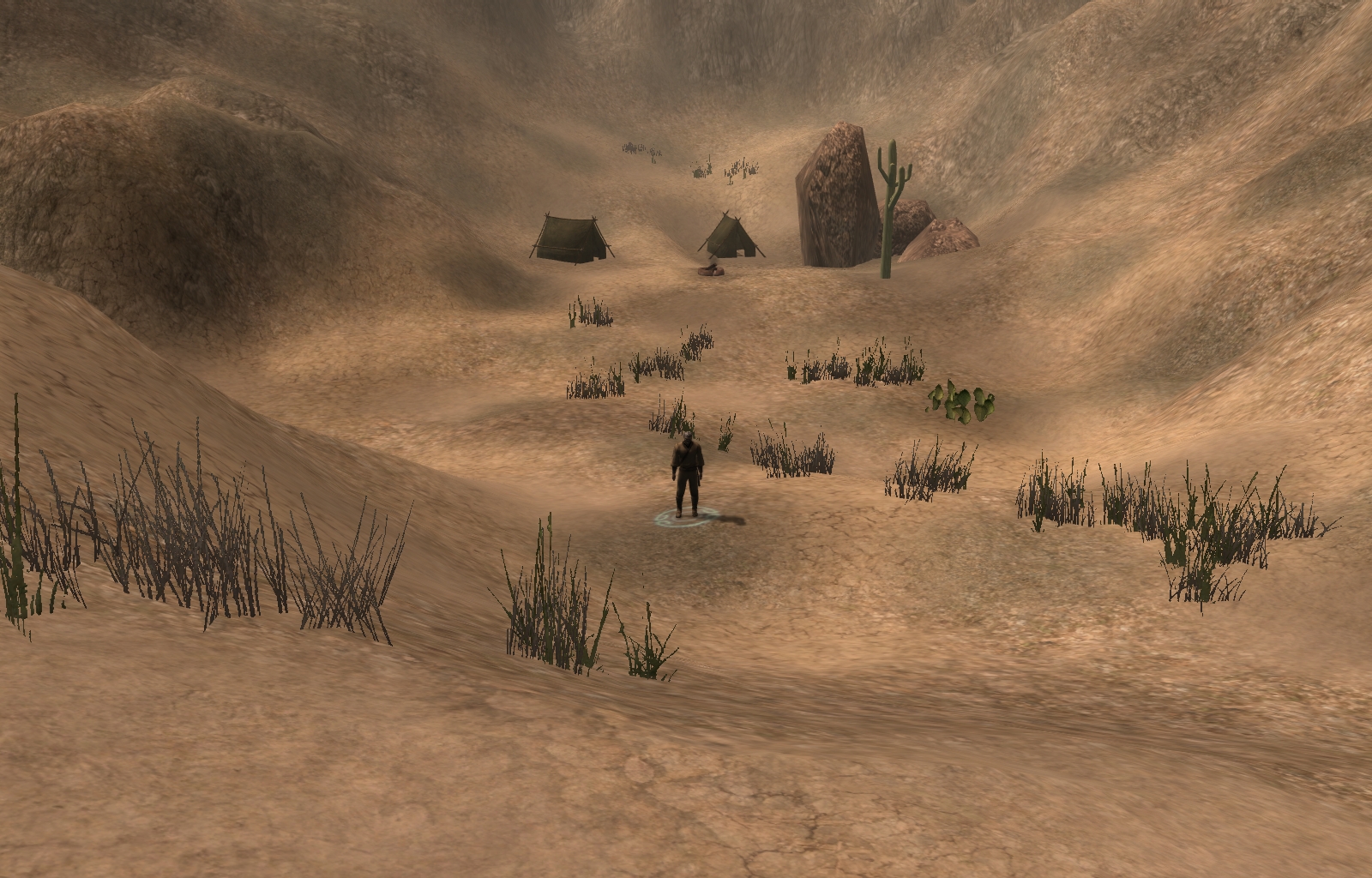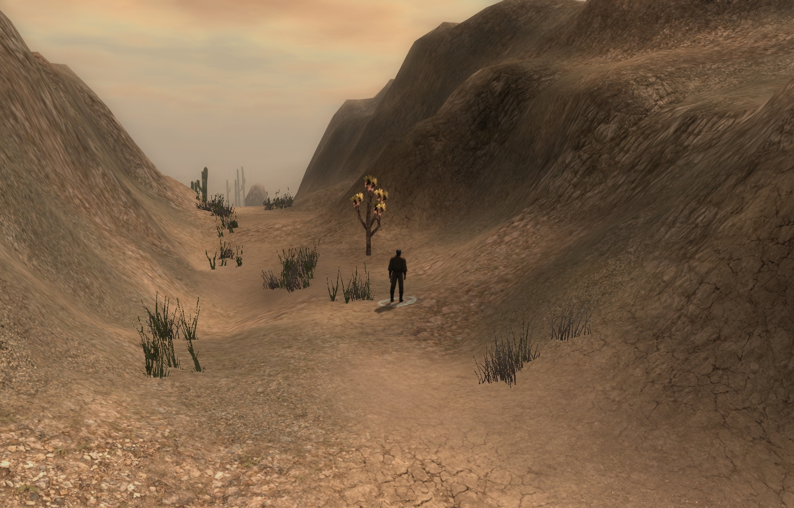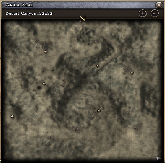 This 32x32 map depicts a desert canyon. It has 3 campsites, a magical portal, a cave at the end of an upward path, a