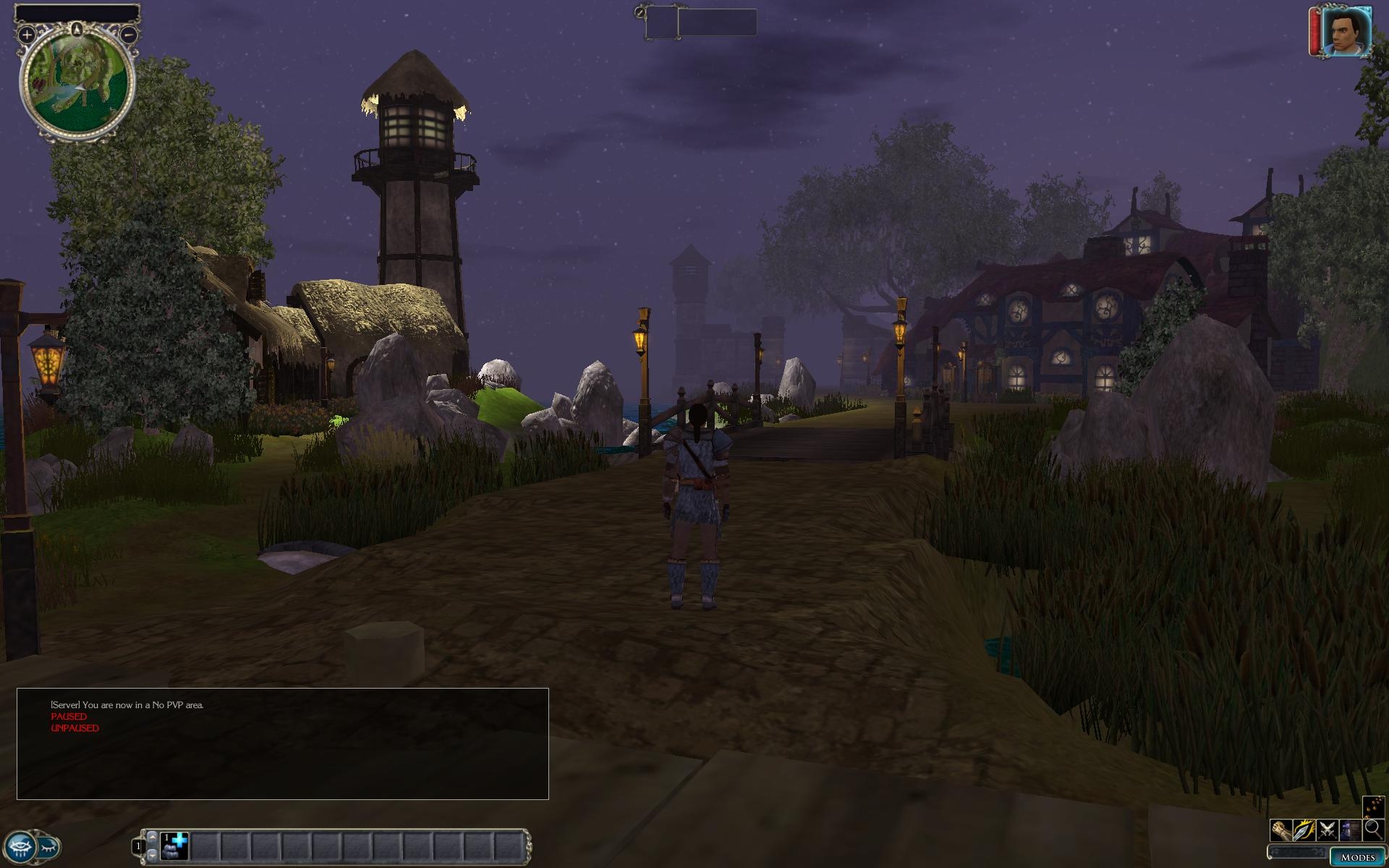 This is a small village 8 x 8 area. No interiors. NPCs have place holder conversations. Some ambiant life. There is an inn, a few cottages, a lighthouse, a dock, a small keep on the hill, a cave entrance, and two main road exits. Signs are examinable. Try staying in long enough for sundown and watch the lamps flicker and the lighthouse shine.