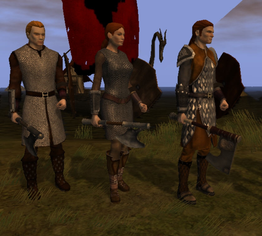 The Norse are slightly taller than most other humans and broader built. (NOTE: I scaled the X,Y and Z-axis according to that). Their hair color ranges from light brown to dark red, their eyes are usually light green to dark brown. Their favoured colors are red and black which mostly reflects on the Nobility as their hide and leather armor usually retains their natural brownish or greyish color.