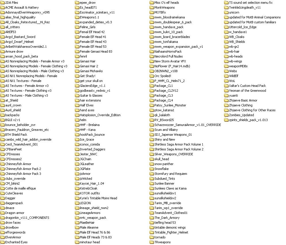 | | those files you put in the override directory (decompressed). Just throw all hakpaks there (if they're on other file type rather than .hak file). Those which are on .hak file, you can use a hakfile extractor and can be downloaded in the vault. |
