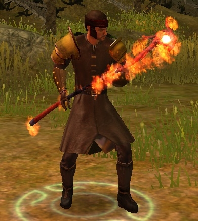 A staff of fire is produced by binding a low-level elemental from the plane of fire to a magical staff. Firestaves are often favored by sorcerors and mages specializing in fire manipulation. Provides +2 to hit and 1d4 fire damage and glows with red light. Casts the spells Fireball, Burning Hands, Wall of Fire, and Flare.