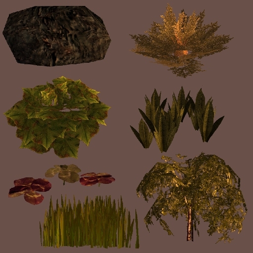 I began work back in August of 07 on a 3rd foliage pack, and am nearing completion. The 3rd pack will contain all the contents of the the first 2 packs which have been optimized and renamed, plus new content. The new content includes some new plant types, trees, vases, planters, cactus variations, winter vegetation, and a module/hak that you can run in game to see all the models in use and be able to easier decide what you do or don't want to use. I will uploading it to the models section of the site, and will be removing this and the 1st pack since they are out of date and it was just too much trouble to try and rename some of the files and textures due to the MDB format limitations. I have experimented with limited animated versions of some of the plants, but its very time consuming and puts alot of work on the end user to get it into the game easily.