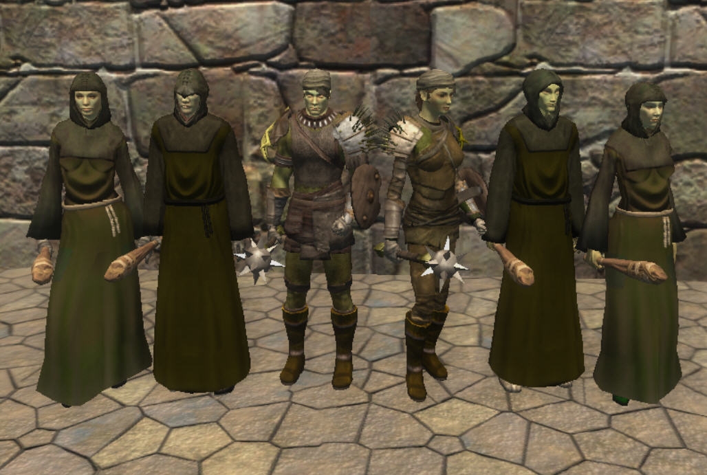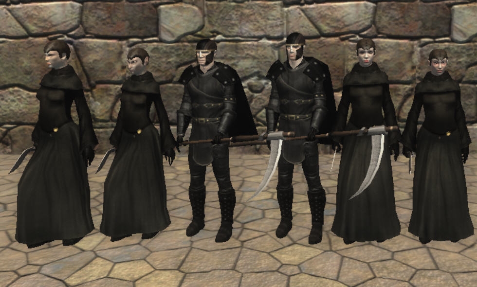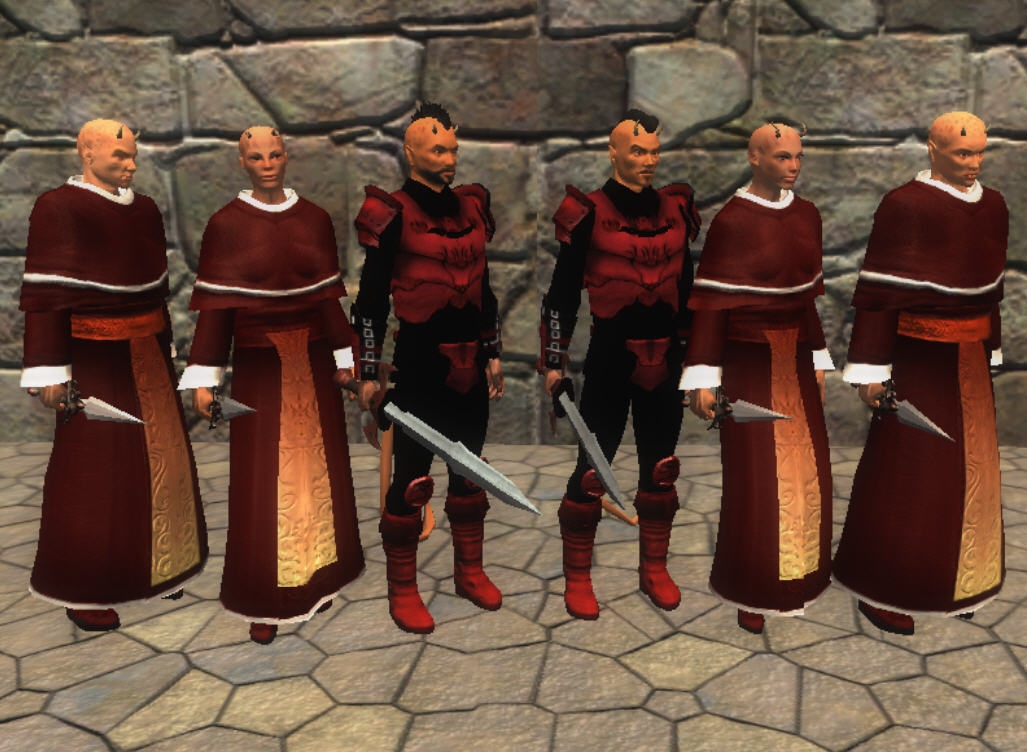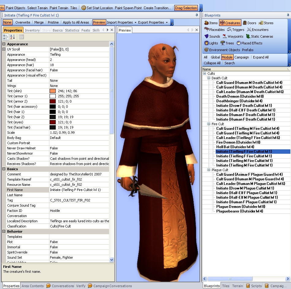The 3 cult themes are carried through for everything: appearance, clothing, color, cleric spells, special abilities, fx effects, creature abilities for skin/hide and claw/bite and. Custom weapons have been included to fit the theme but only those of the leaders are magically enhanced. The Guards (lvl 4 Fighters) had the longsword feats swapped to their equipped weapons.