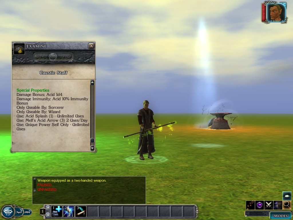This is a custom mage staff with acid abilities. As you advance the staff is upgraded through a conversation using skill checks and saving throws. There are six levels starting as a mundane magical item to the final upgrade for a level 20 wizard/Sorcerer.