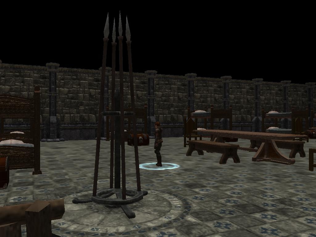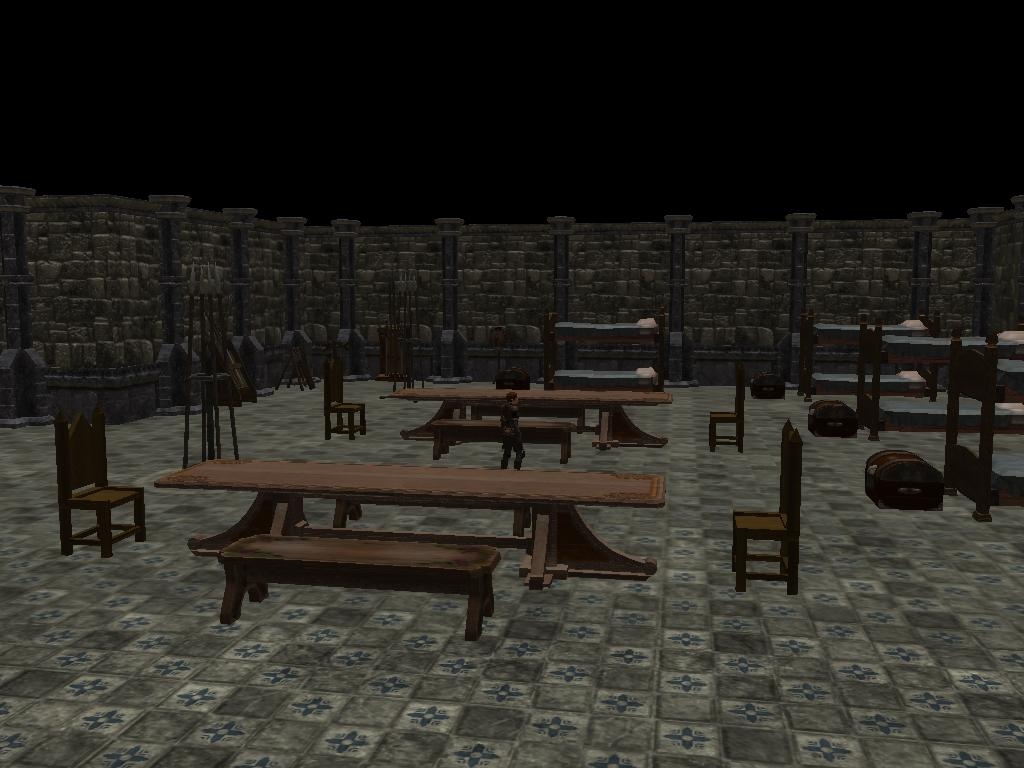 The beds, chests, tables and weapons for a 3 x 2 interior room. Good for any interior. No wall hangings due to difficulty in aligning them. Listed in prefabs as Merman Barracks.