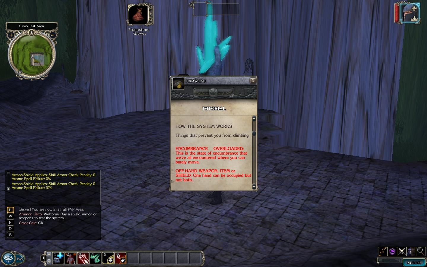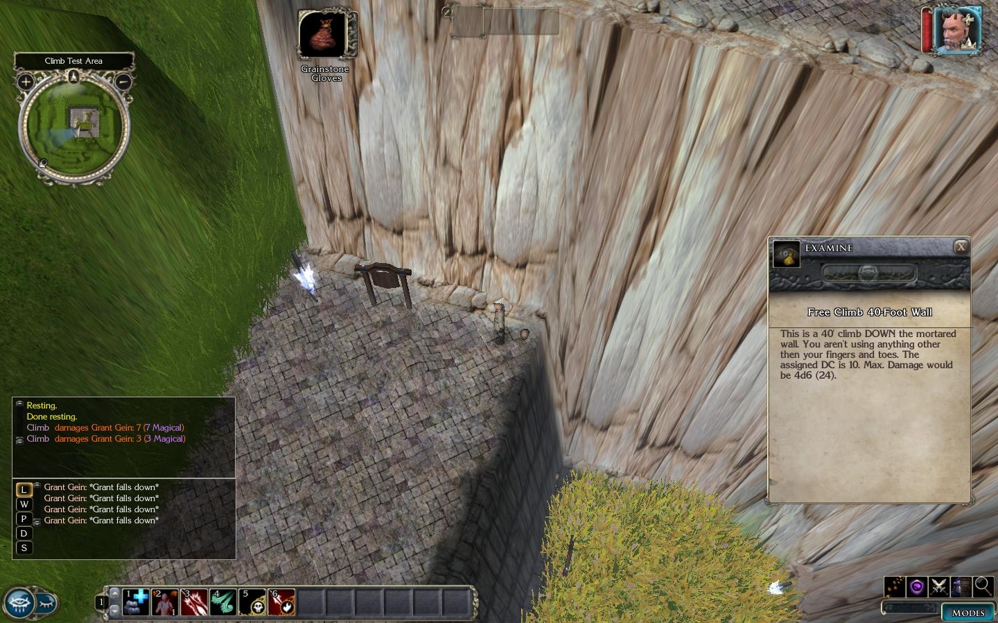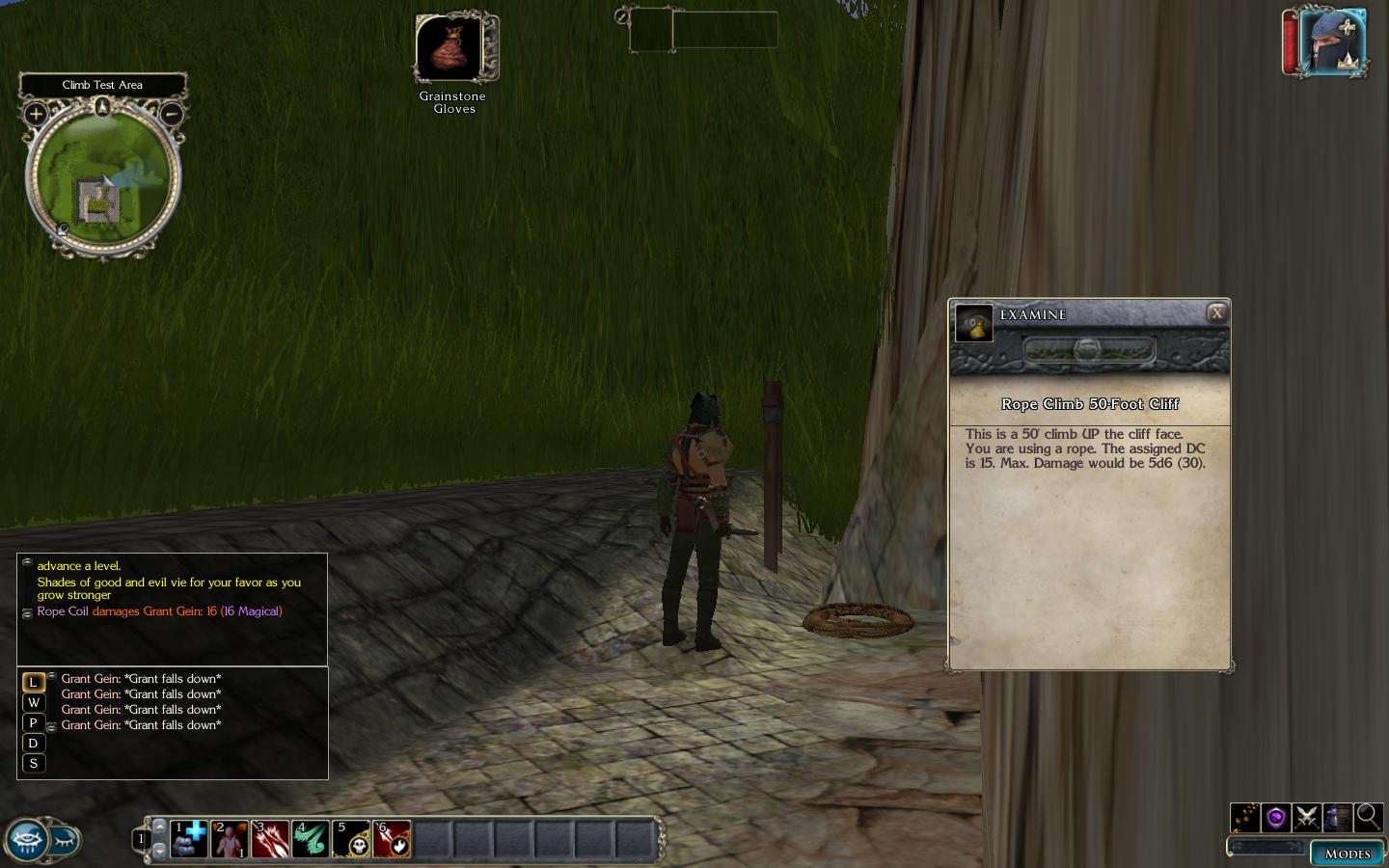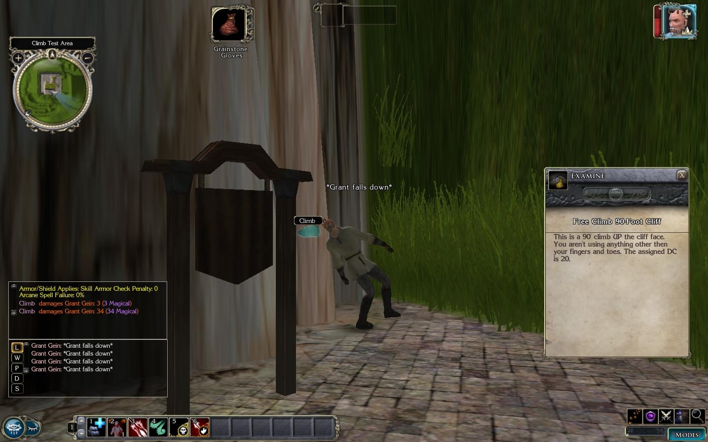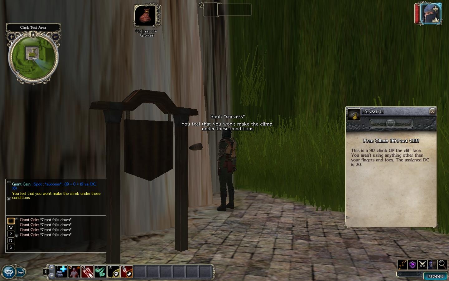 However, like all things converted to NWN, PnP rules have to be tempered against timing and in game situations. For one, we don't make time pass and move the individual in increments up or down the wall over that time. I avoided doing that simply to keep the system simplified and too avoid combat issues. So in that vein we had to uncomplicate the system a bit.