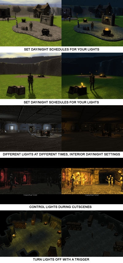 Pretty nice! I'm definitely using it in my module. However, I was disappointed that the prefabs don't include any sounds. Also, placing a fixture requires several steps just to achieve the basic day/night lighting behavior, which is all I'm interested in. It requires typing in a light tag, usually an FX tag, sometimes a sound tag, and then copying all of those to the fixture. It'd be nice if I could just slap down prefabs and get a default behavior with no tag or var editing. Regardless, nice job, Slayster. Thanks a lot!