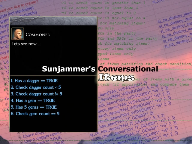 Sunjammer's Conversational Item Scripts address a number issues with the standard item-related conversation conditional and action scripts. These new scripts (where appropriate) are stack-aware, allow the builder to specify the category of targets (PC, PC party members or all party members) and allow the builder to specify the location of items (equipped, inventory or both).