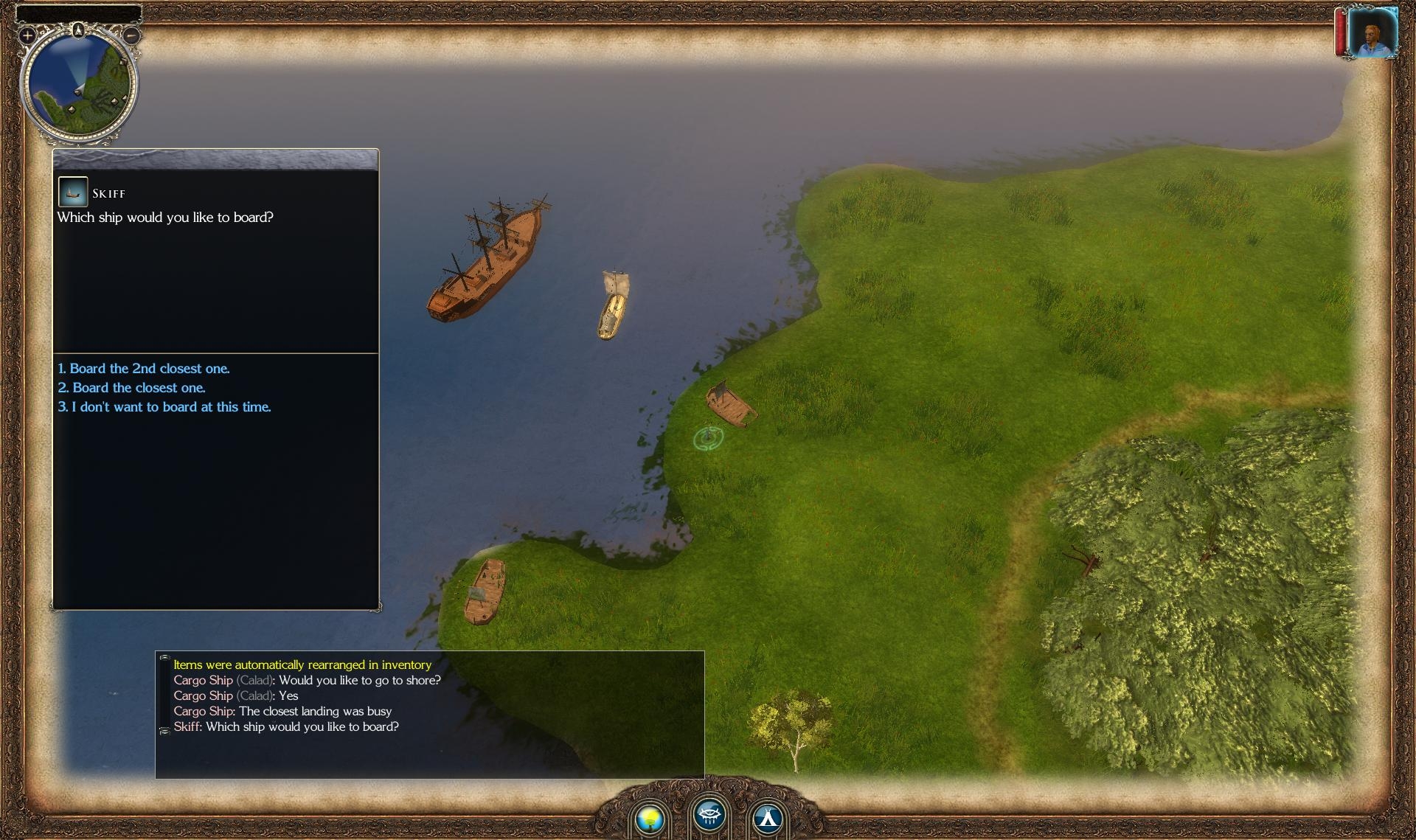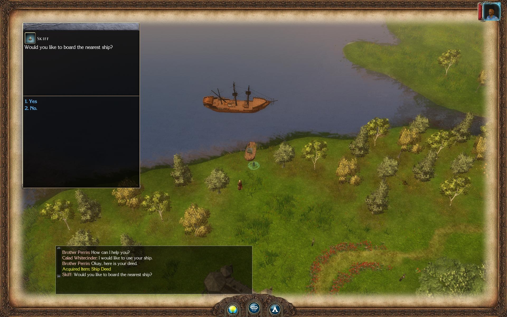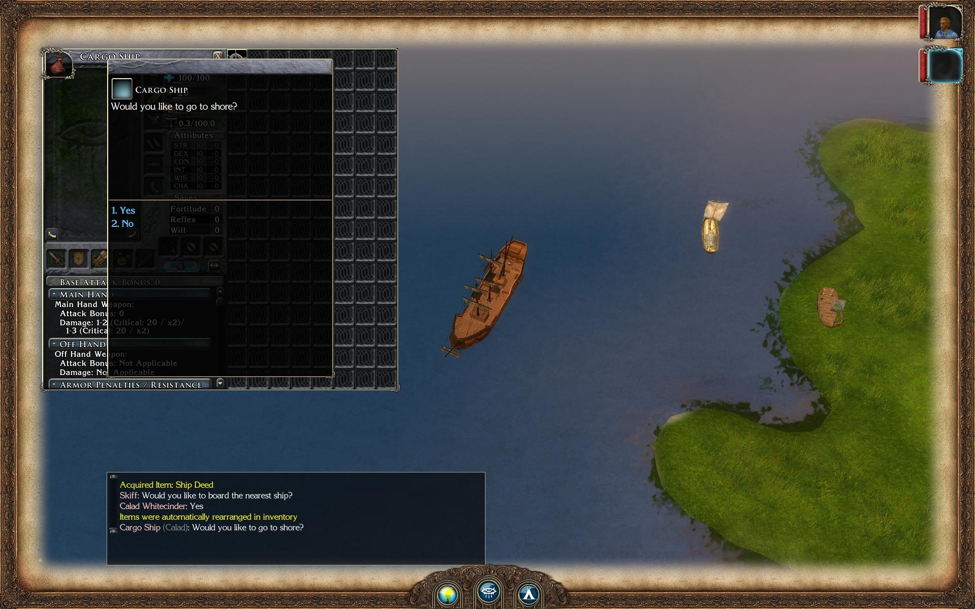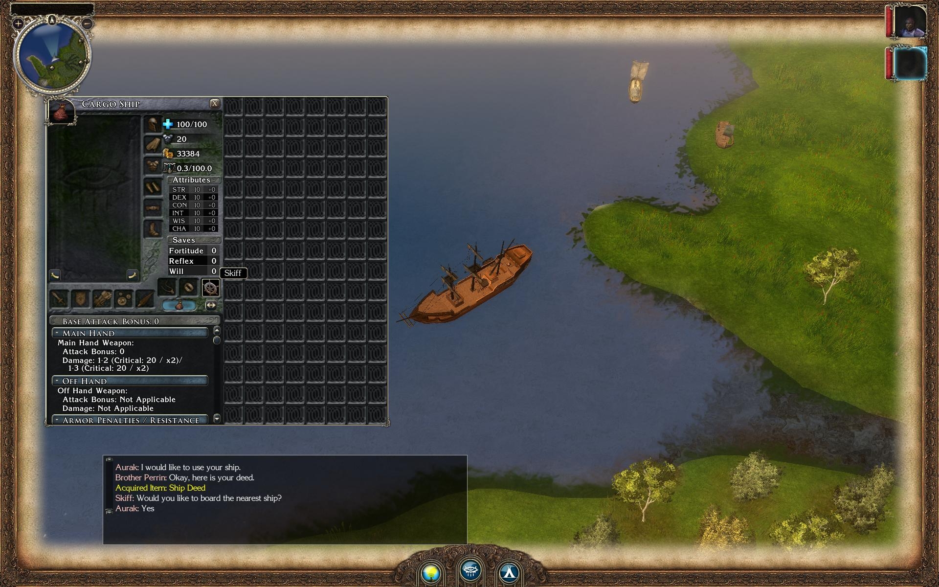Demo Module: This modules contains a single overland map area with two ships anchored near the shore. The larger ship requires a deed to board it, so you will need to speak with Brother Perrin to obtain one. A smaller ship to the north may be used without a deed. To board a ship, just click on one of the skiffs and you will be prompted from there. When you are on a ship, you will find a "skiff" item equipped in one of the ships inventory slots. If you want to return to land, just unequip the skiff.