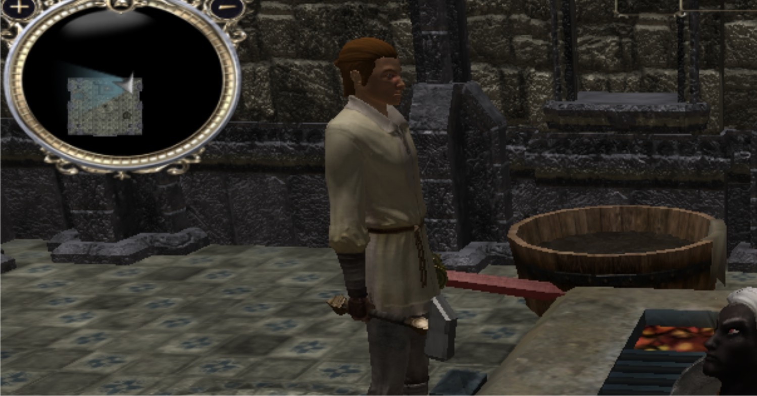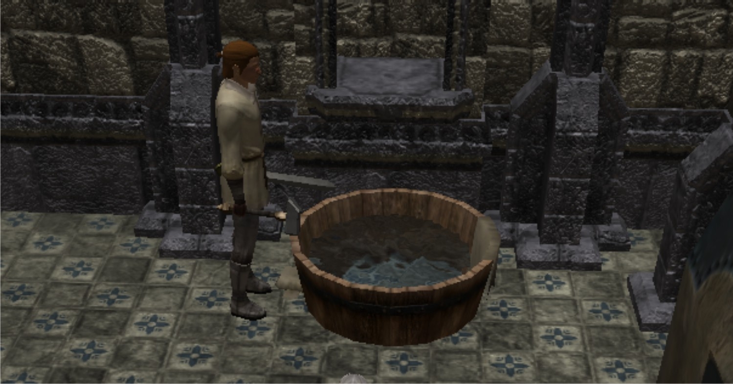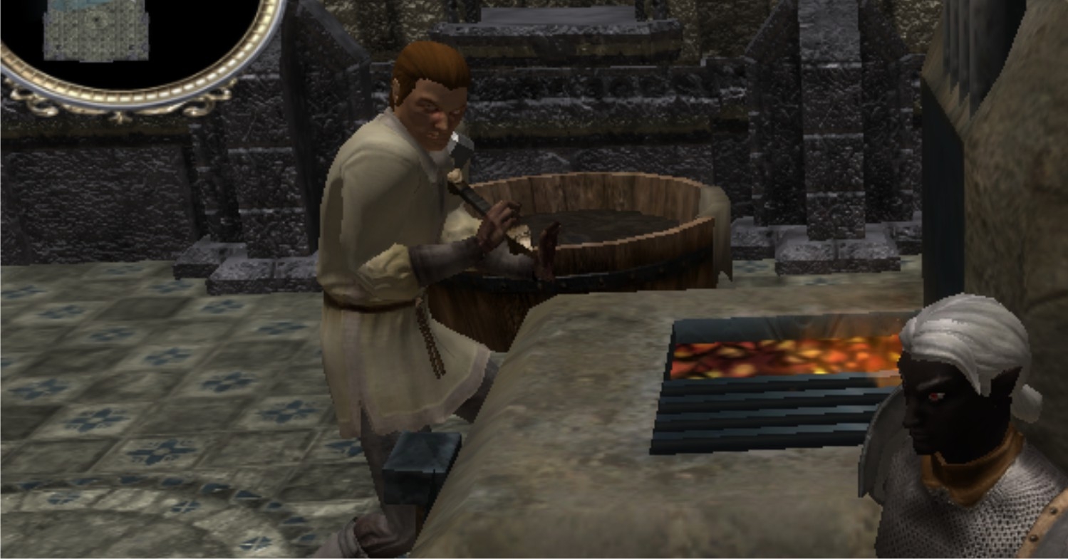 2.After working the work piece the blacksmith quenches it in a water tub (complete with steam sound and visual fx)