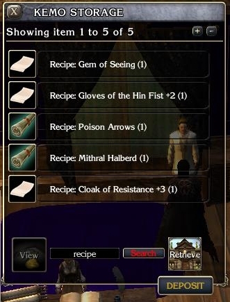 This is based on the Consignment/Auction system, and has some of the same features, such as the ability to do searches for storage contents (for example, type in "Recipe" and it will show all of your stored recipes) and the ability to Examine stored items without retrieving them.