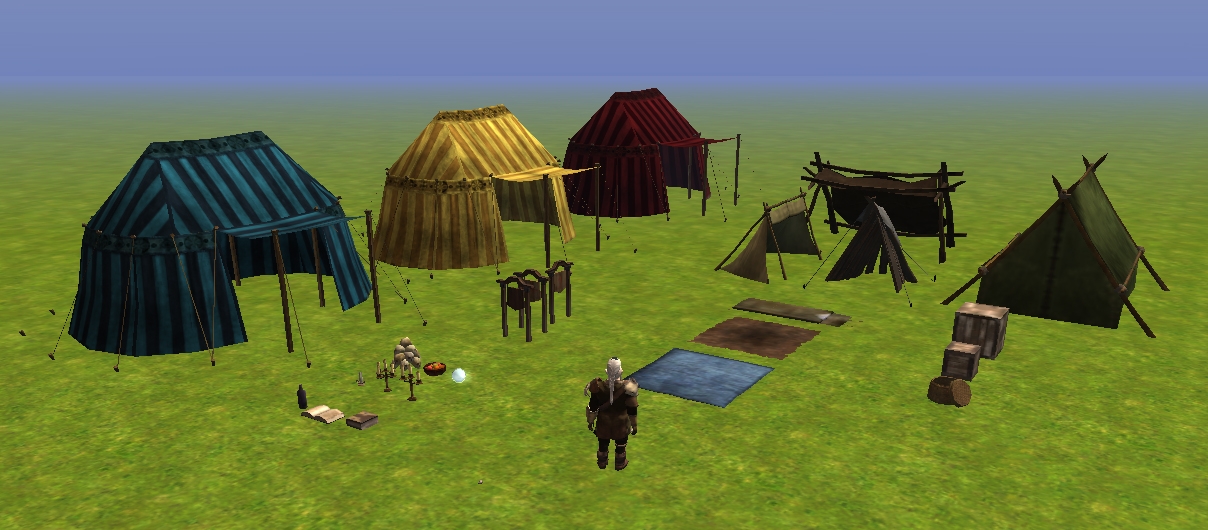 The following prop blueprints have been included: Bedroll, Book (Open), Book (Closed), Bottle, Candle, Candelabra (Three-Flame), Candelabra (Five-Flame), Camp Tent, Crystal Ball, Faire Tent (Cerulean), Faire Tent (Golden), Faire Tent (Scarlet), Fruit Bowl, Leanto (City), Leanto (Plain), Leanto (Woodland), Picnic Blanket, Pile of Skulls, Sign (Generic), Sign (Left/Right), Sign (Straight Ahead), Ragged Tarp.