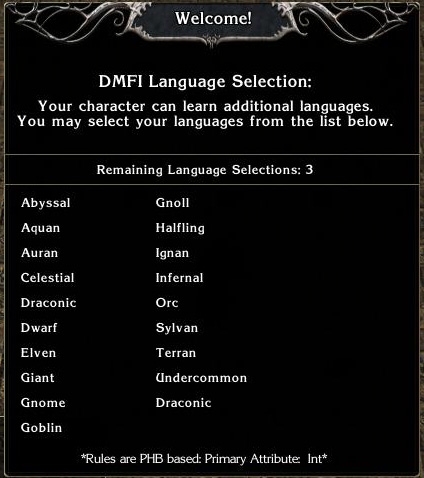 I'm sure there's an obvious answer to this, but I'm just not seeing it. I had languages disabled in the previous version. Existing PCs are not getting languages assigned to them. Only new characters and those from which I manually remove the DMFI tool. Is it possible that the code for removing old versions of the tool is not firing? Or is there something simple I need to do to make sure languages are re-initialized for these characters? _________________________ Dasaria2 Story/Campaign PW Link