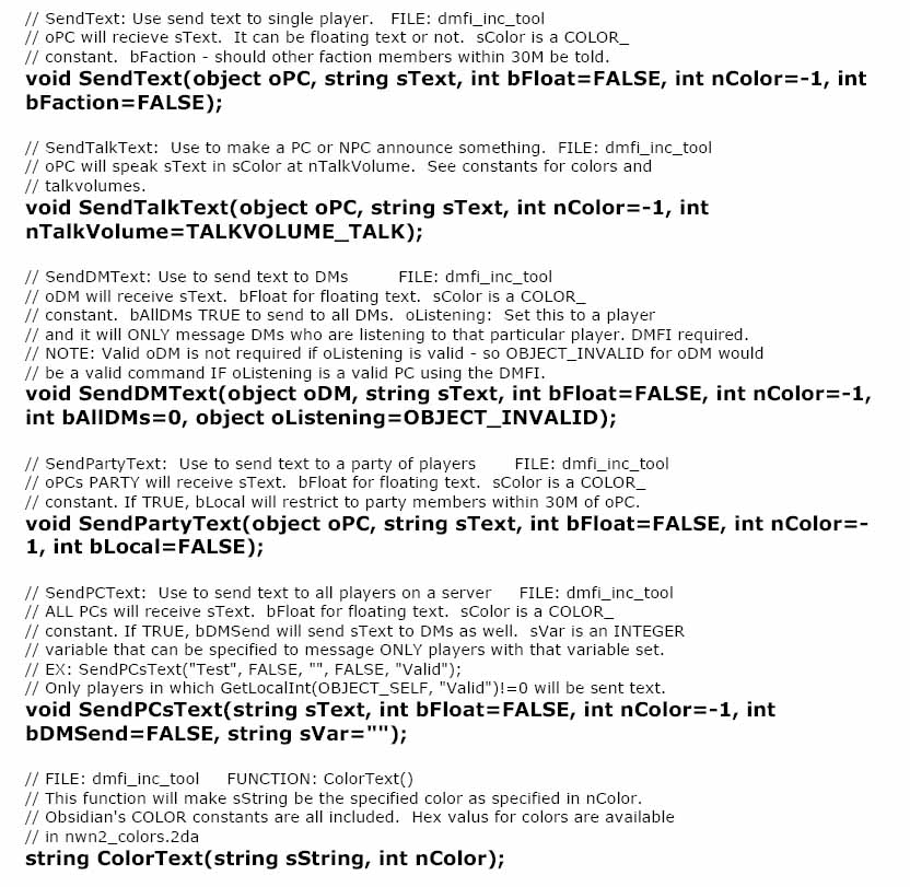 This is a relatively simple include file that aims to improve basic message sending with NWN2. It includes 5 basic functions for sending text to players with color text support.