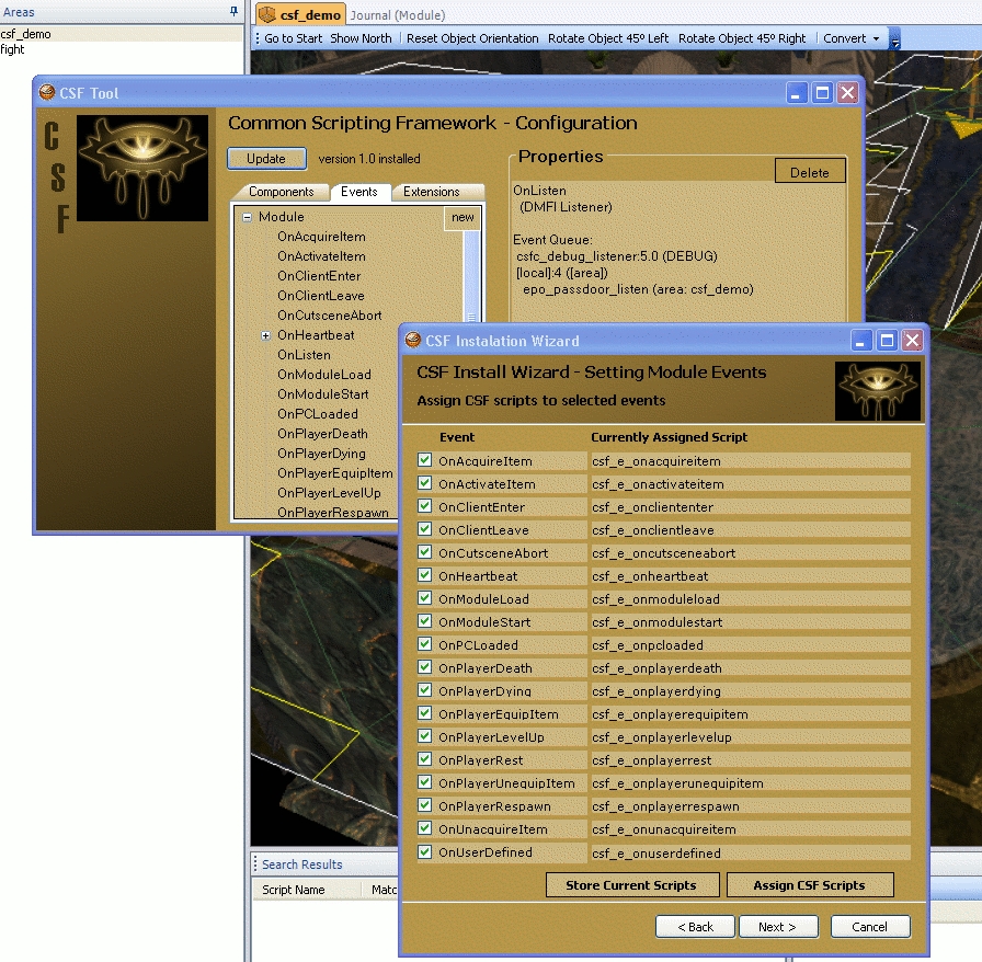 The Common Scripting Framework (CSF) addresses the problems that designers encounter when incorporating various packaged systems into their module. Many modules will use several systems (e.g. DMFI, HABD, HCR, NESS, etc) Most require the editing/merging of module or area event scripts and demand the designer follow detailed instructions to install and update the systems. CSF allows the module designer to easily install, remove and configure any number of packaged systems. It is essentially a simple way to manage queues of scripts for various module events.