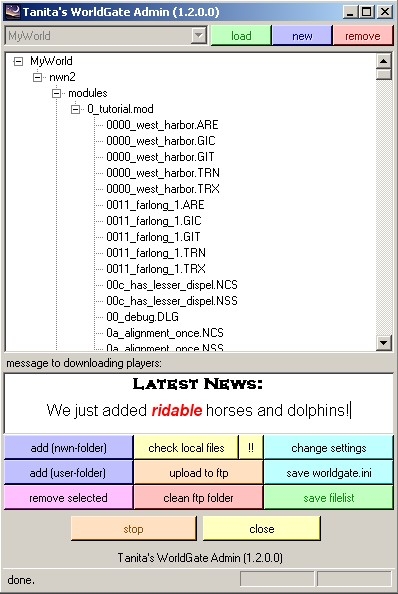 now you can chose between ftp and http, so worldgate should be usable in almost any hosting situation. it now is fully nwn1 compatible, even on filelist level.