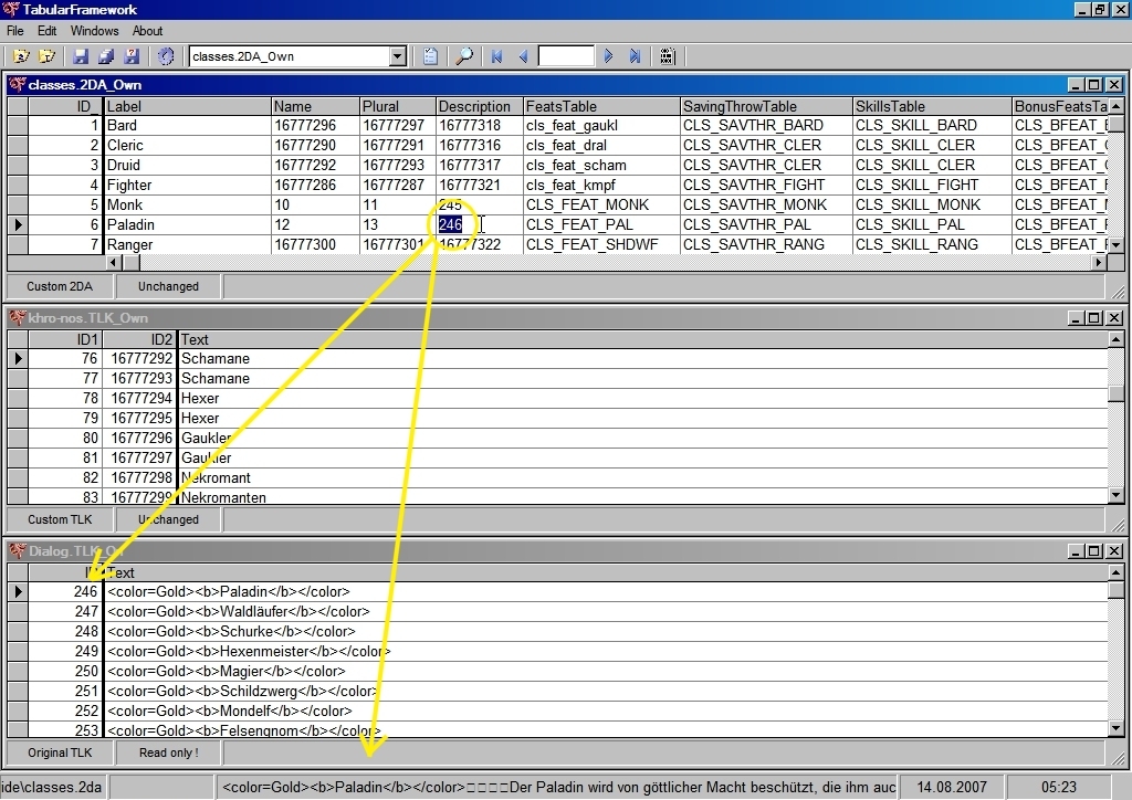 TabularFramework zeigt während des Bearbeitens von 2DA immer die dazu passenden TLK Einträge als Text in der Statusleiste an, meiner Meinung nach einen unschätzbarer Vorteil. Dabei unterscheidet das Programm zwischen Einträgen aus der dialog.tlk und der Eigenen TLK.