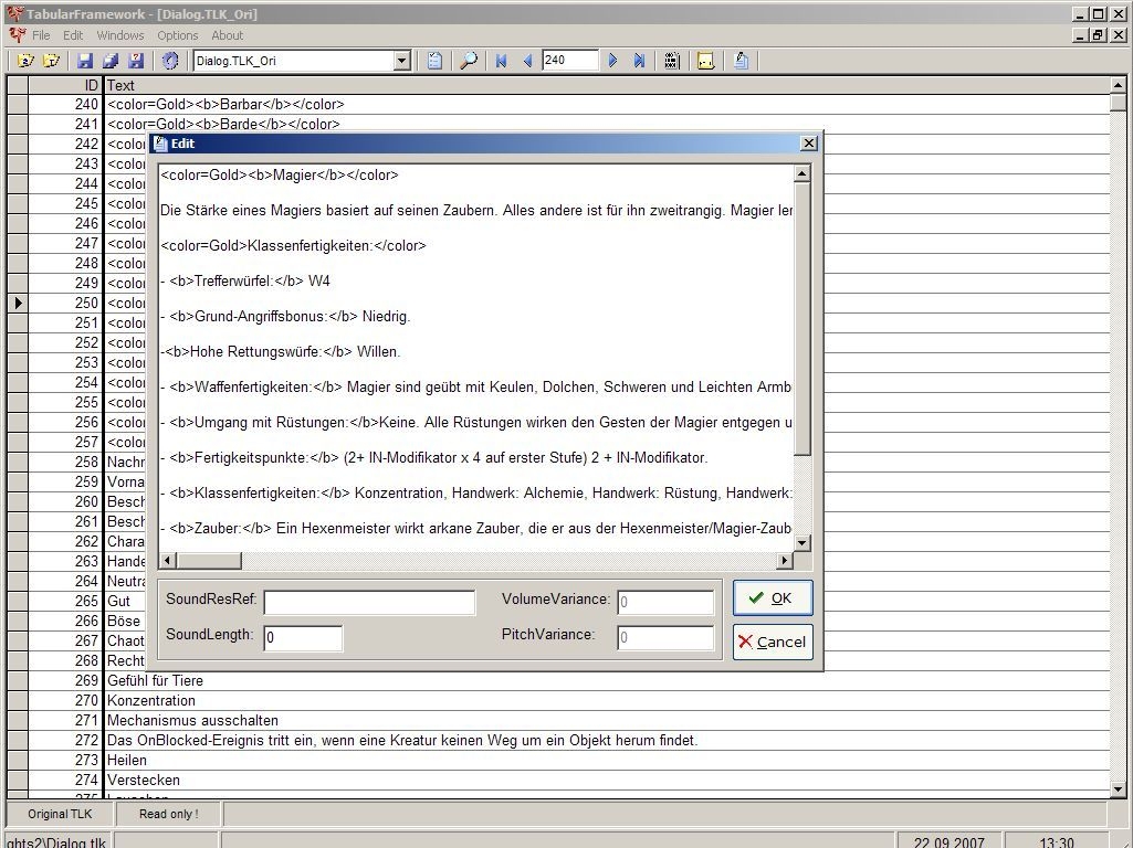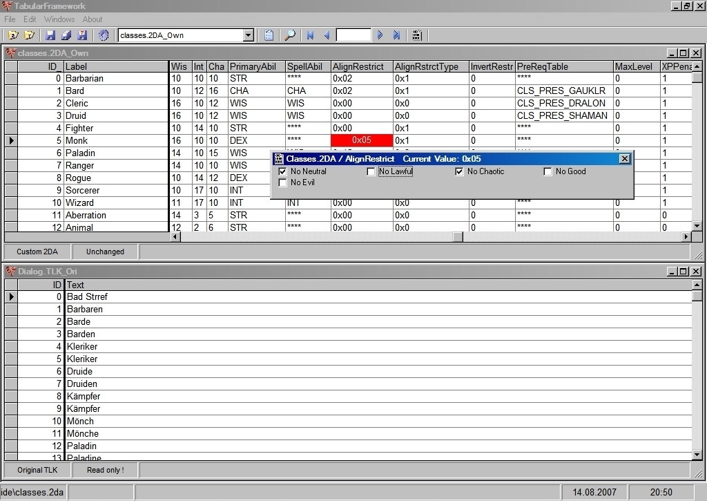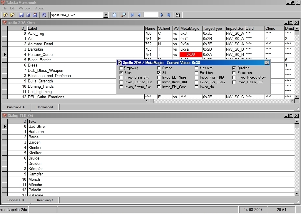 (Deutsch) Hierbei handelt es sich um einen kombinierten 2DA-Editor und TLK-Editor mit viele Extra-Funktionen (inkl. deutscher Umlaute oder andere Sonderzeichen). Beim ersten Start werden alle Original 2DA und die Dialog.tlk in eine interne Datenbank eingelesen, macht vieles schneller!