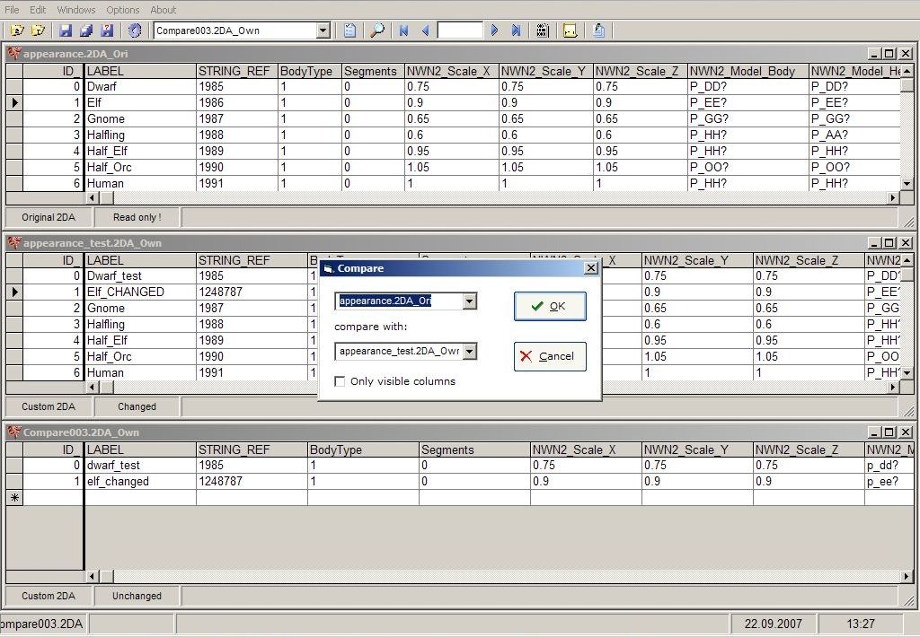 Compare 2DA and TLK files, find real differences (equal rows are shown once!).