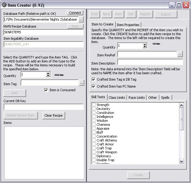 Given this, I hope you will explain what changes I must make in the Item Creator's database path field (which installs as "..\Database") and the NWN Recipe Database field (which installs as "SKNRITEMS.DBF") in order to save the custom item I am creating. Since I want the item to cast a particular spell once a day, I'd also appreciate some clarification of the cryptic note directing the user to the NWN2 toolset (which I find utterly incomprehensible) list of spells.
