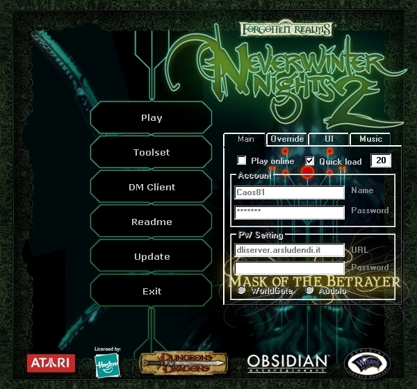 Or, as an addition to my previous comment- it would be nice if this launcher would default to a clean override at every launch, and the player would have to select to use another in the dropdown menu. This is simply so one world couldn't screw up another if a player forgets to clear the override before switching servers. (or maybe it already defaults to this . . .) _________________________ NWN Campaigns - the NWN/NWN2 Campaign Database Naeldor Weekly Campaign
