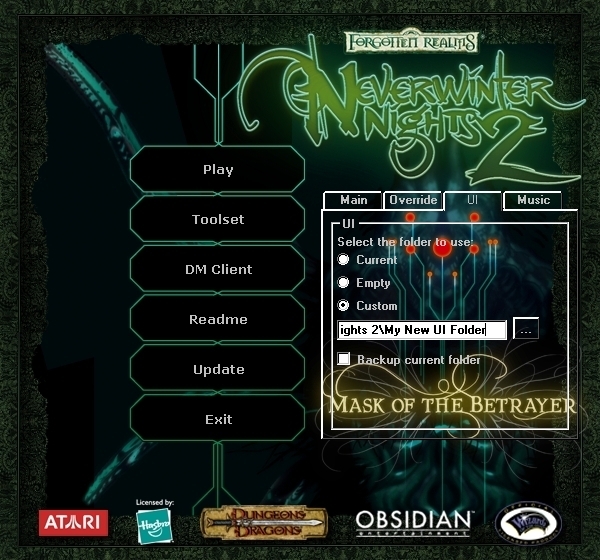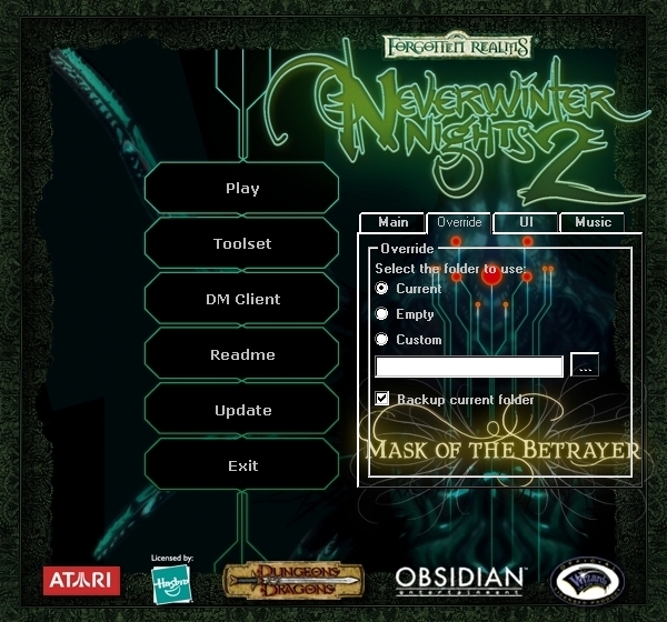 I've only looked at the screenshot, but is there a "use empty override folder" option? If not, this would be nice to have, as it would be an easy way to force a "clean" override folder before joining a server that doesn't use the override directory (since there are reports of overrides crashing some servers). _________________________ NWN Campaigns - the NWN/NWN2 Campaign Database Naeldor Weekly Campaign