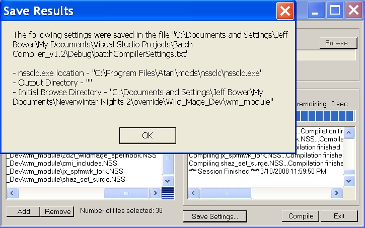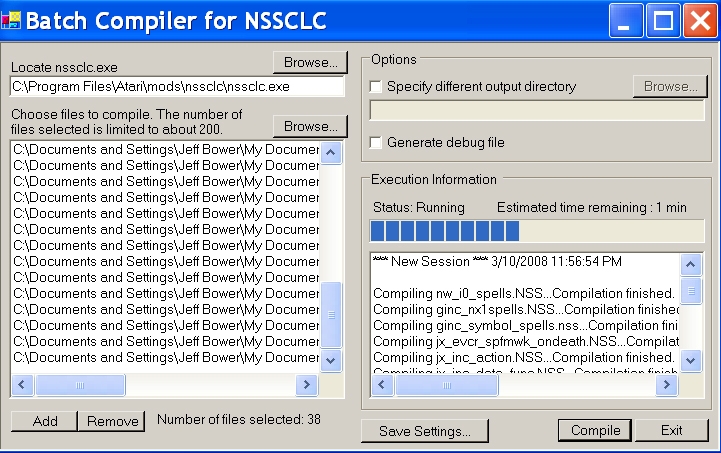 - Added a �Save Settings� button that will create a text file in the working directory of the batch compiler that stores the nssclc.exe location, the last directory browsed, and the output directory if enabled. This file is read when the program loads automatically restoring your saved settings for your compiling convenience.