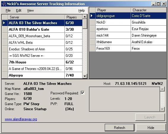 The server details section at the bottom of the screen contains relevant information about the server as extracted from the server itself. It also contains additional information as set up in the Edit Server List screen for each server. The Online/Offline value is the time the server went offline or came online. This will be set to Since Startup if the status of the server hasn't changed since the application was started. Hovering your mouse pointer over the time online/offline will pop up a tool tip informing you of when the application was started. Next to the time online/offline is the amount of time the server has been online or offline. If the status hasn't changed since startup, this will only be the amount of time since the application was started. The link at the bottom right is maintainable in the Edit Server List screen. This is a hyperlink, using whichever browser is set as the browser in the Edit Settings screen (default Internet Explorer). The Launch button will perform a direct connect to the server. This will only work for NWN1 servers that are online and if NWN1 is installed on the machine.