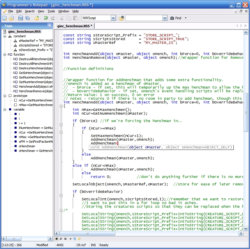 - Syntax highlighting - Code with NWScript keywords colored the same way as in the toolset.