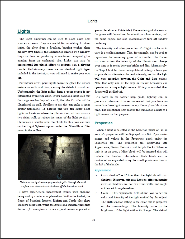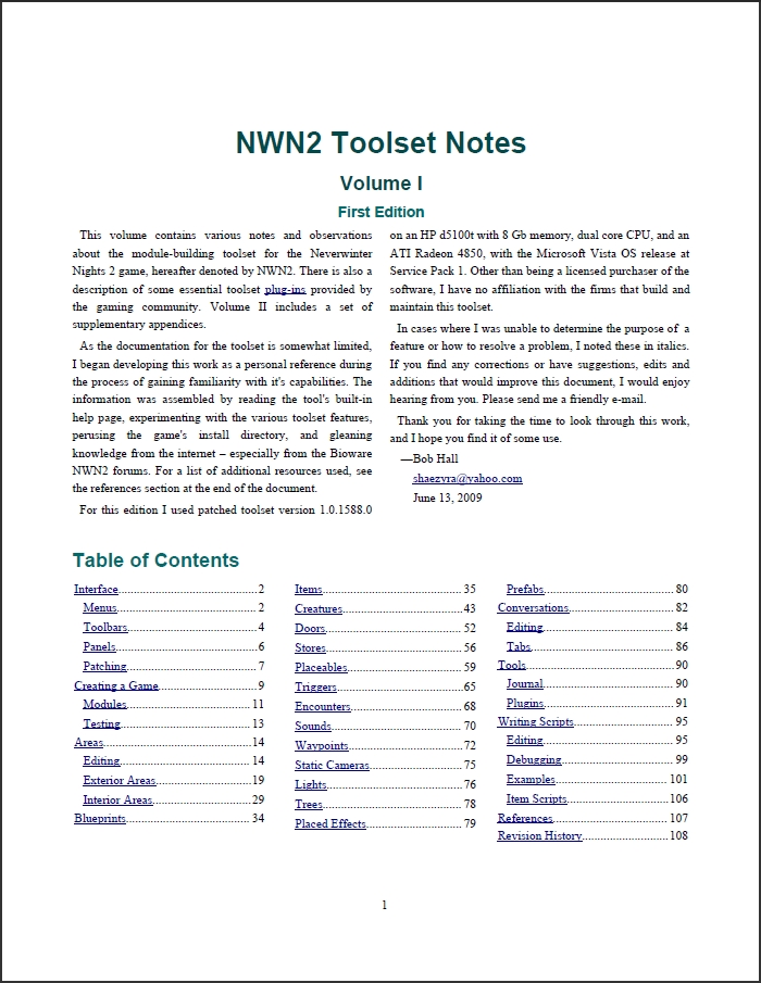 This is the sixth edition of a four volume set of PDF files that contain notes, observations and appendices about the NWN2 toolset. It is primarily intended for novice to intermediate-level editors, but it also contains reference information that may be useful for more experienced editors.
