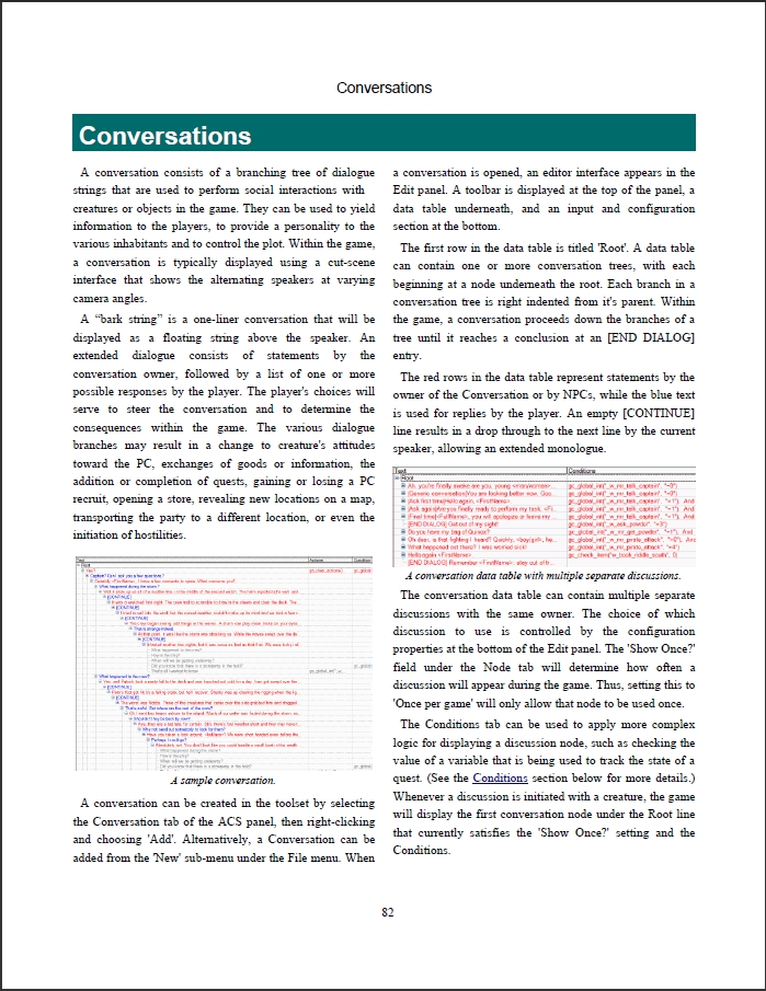 The fifth edition contains additions for crafting items, recipe books, the World Map Editor, special items, special abilities and deities. There is also more information on lights, sounds, creature scripts, selected script commands, the debugging console, and area appearance. This version adds a third volume containing some sample scripts that you may find useful. Finally, it contains a few corrections. Thank you for your support.