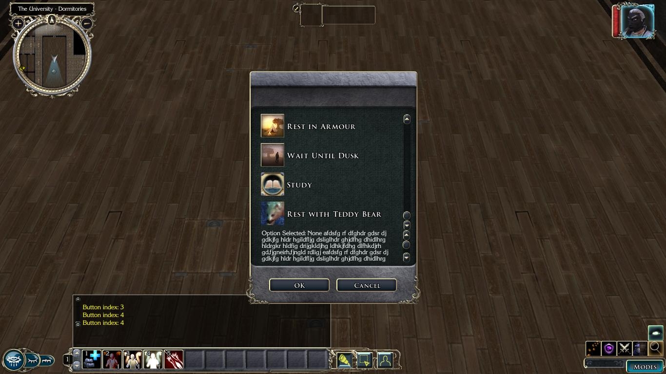 Resting: One of my favourite activities. I often spend whole days just slobbing around. However, over at the BioWare discussion boards, some people seemed to be insinuating that this most unexerting of activities was boring. So, I decided to drag out this old project of mine, fix it up and make it fully customisable, with the aim of giving people the option of making resting more interesting.
