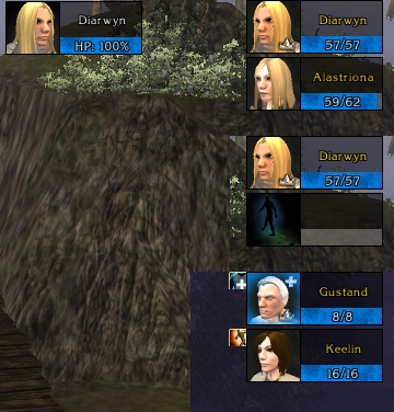 Example of the Friendly Target Frame, and three examples of the PC Partybar, with a member in another area, a level up, member down on health, etc.