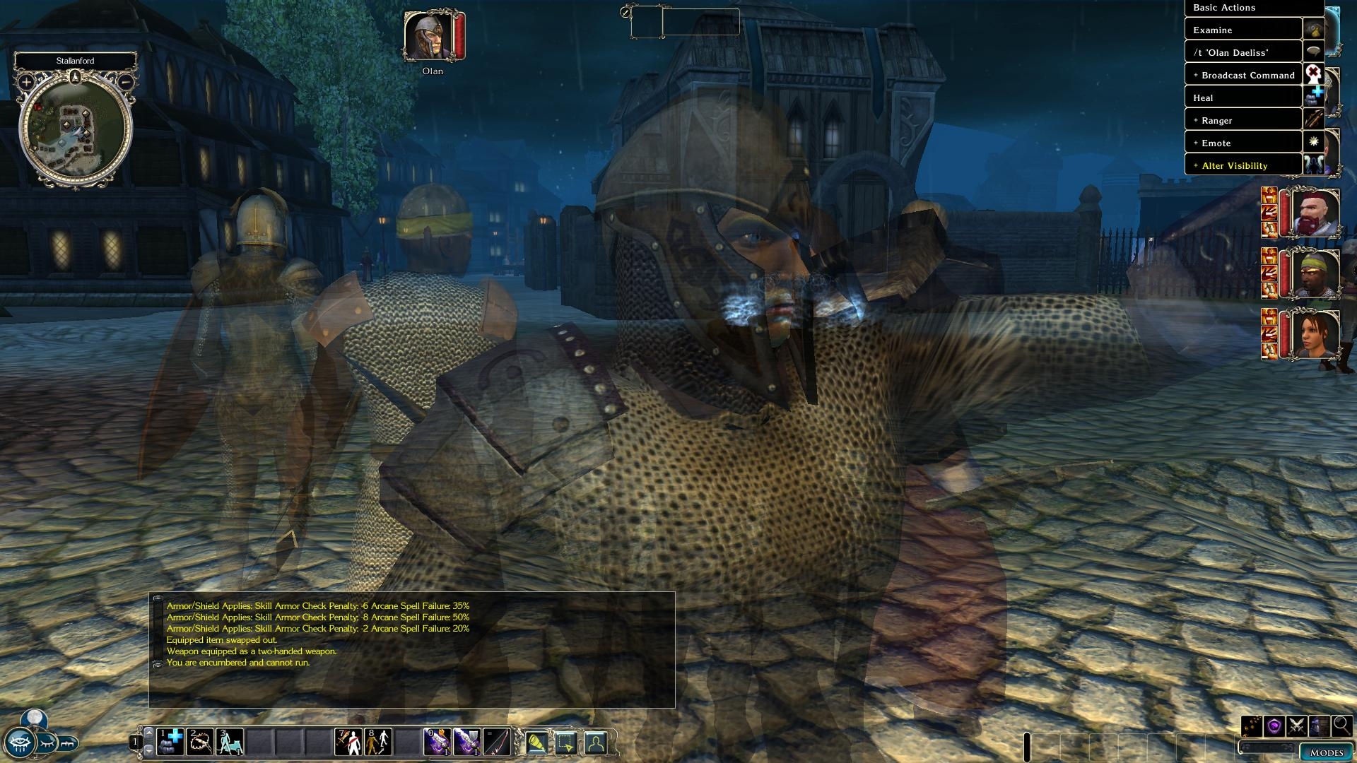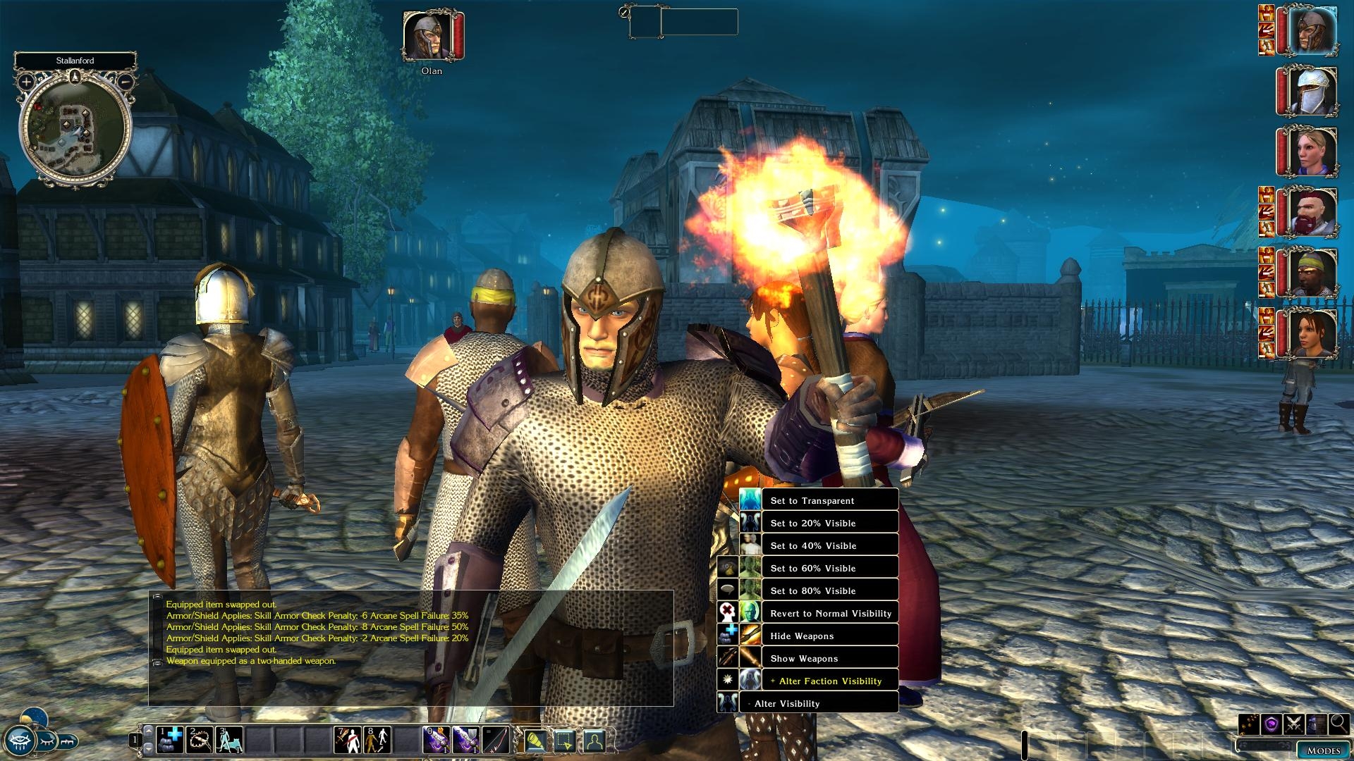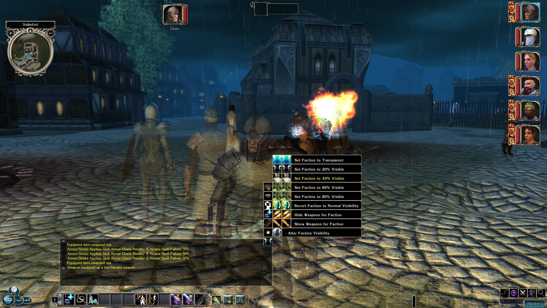 Install in your NWN2 override folder and this will add an option to the player menu context menu that allows altering the visibility of the character or faction to transparent or degrees of visibility (20%, 40%, 60%, 80%). This affects only the appearance of the character(s) in the game, not functionality. When complete transparency is selected any weapons will also be hidden. Weapons can also be hidden when partially visible via the Hide Weapons and Hide Faction Weapons menu options.
