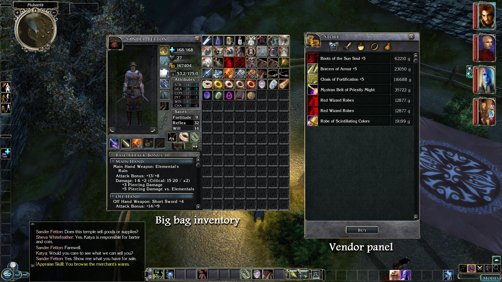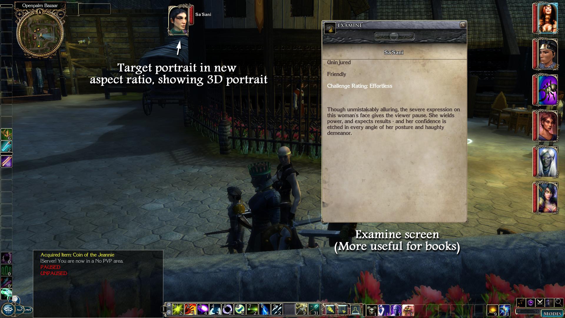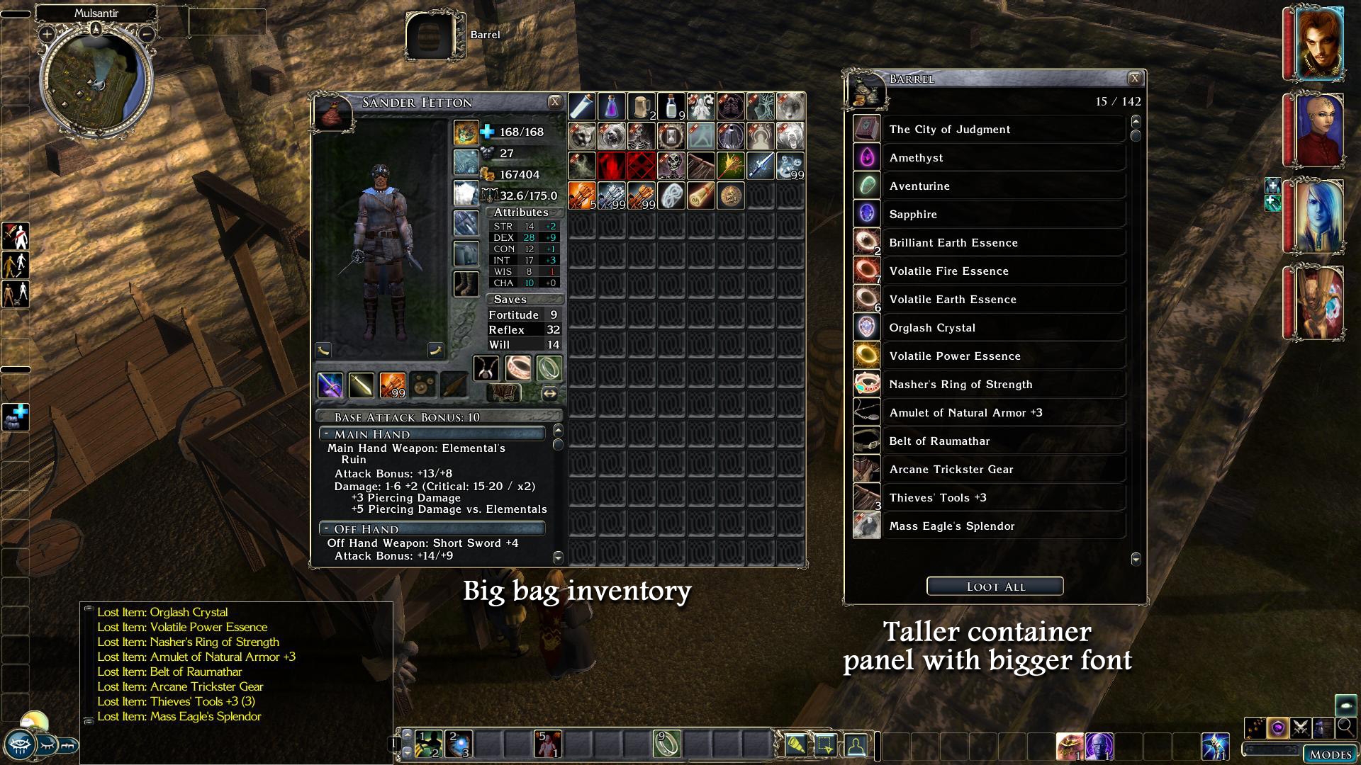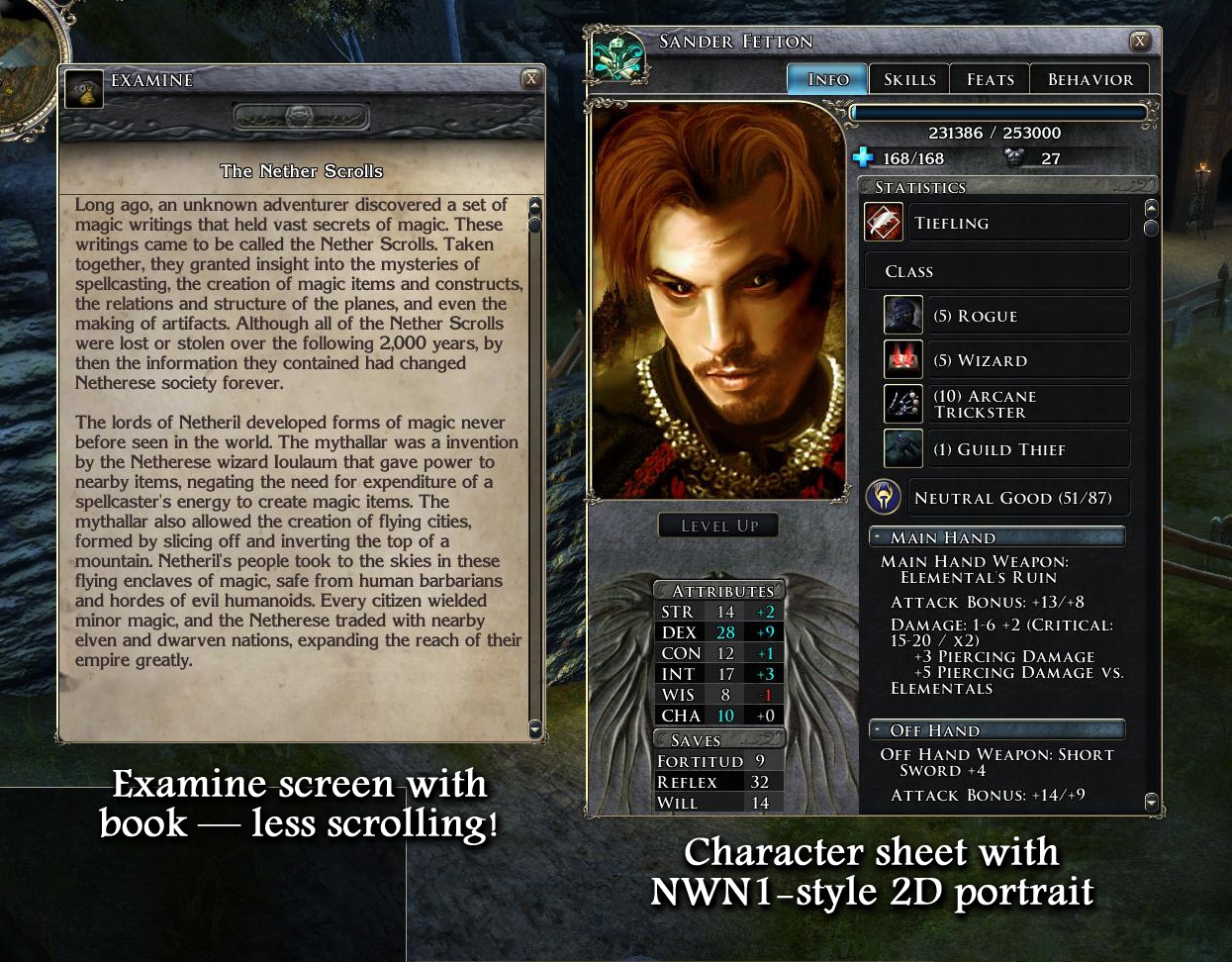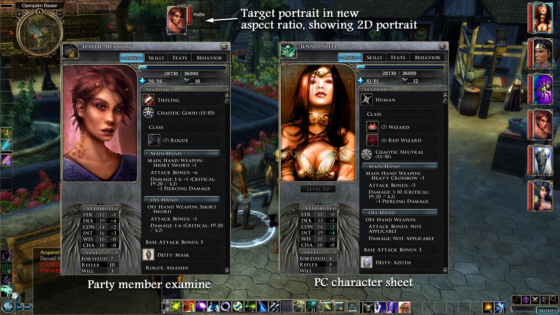 Ragnorak's Expanded Lists for Hi-Rez, Shin-Anubis/Thanatos2001's Character Sheet NWN1 Portrait support, and Fire&Ice/WhatIsSol's Big Fonts UI are excellent UI mods, though they were designed for somewhat lower resolutions than 1920x1080, and have slightly different goals which don't work together perfectly. My goal was to expand everything, redesign some UI aspects, and get everything nicely integrated.
