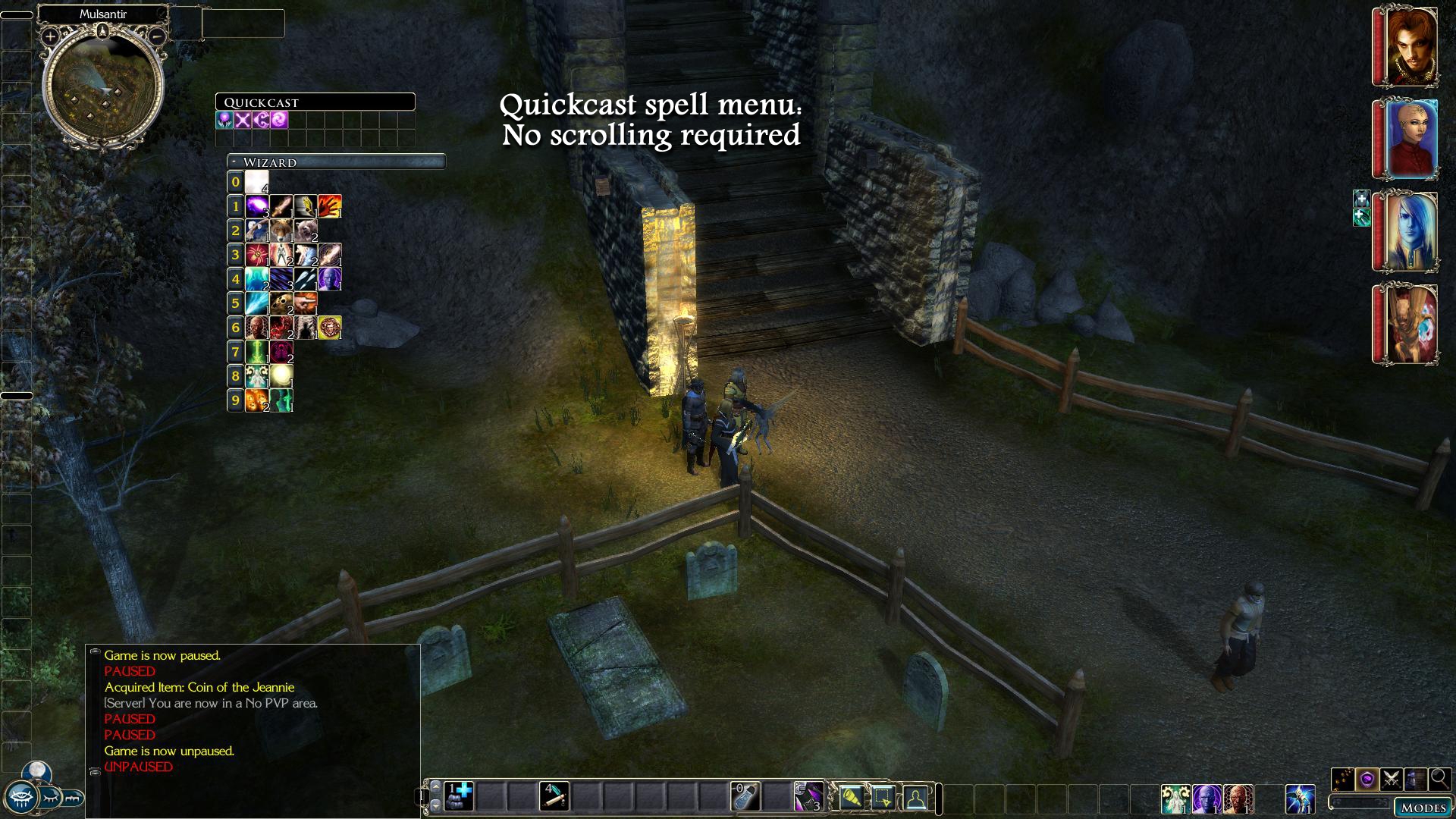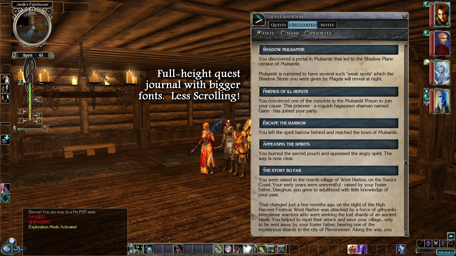 Finally, I expanded the column of portraits for your party members to use the full height of the screen at 1920x1080. Even in the vanilla game, there are times when you can have 5 full companions and enough animal companions/familiars/summoned creatures to make you have to scroll through the portrait column to check your companions' health or status effects. Now there's less unnecessary scrolling at 1920x1080.