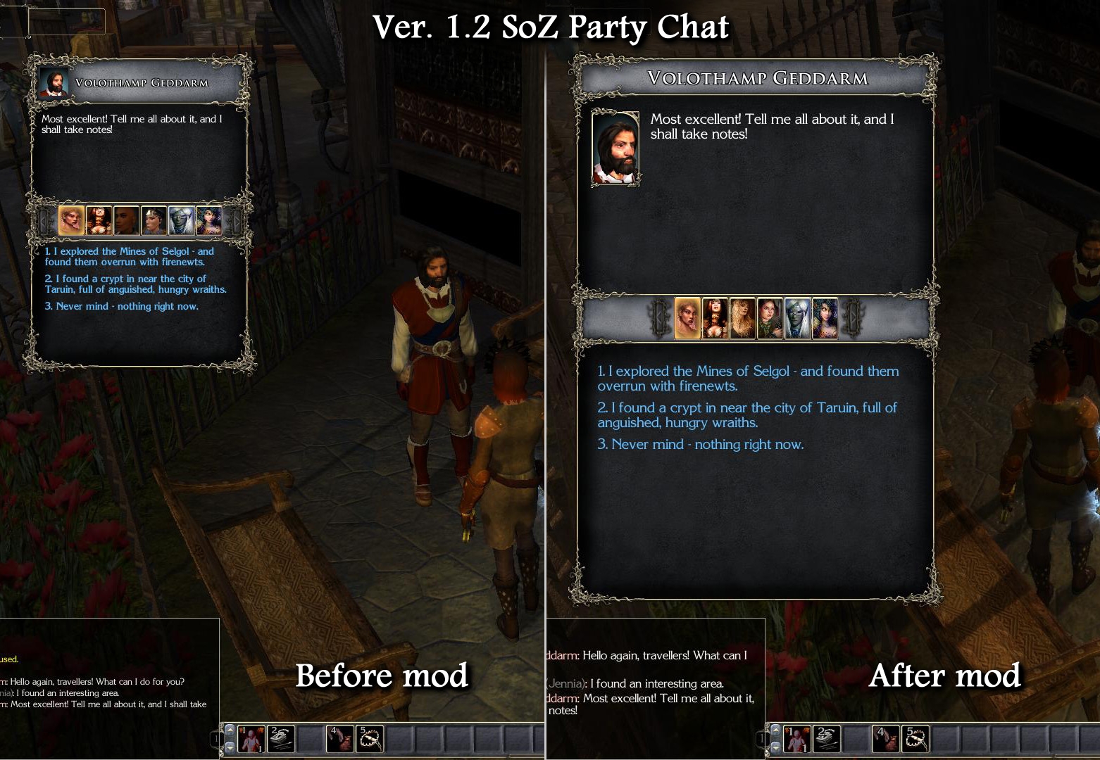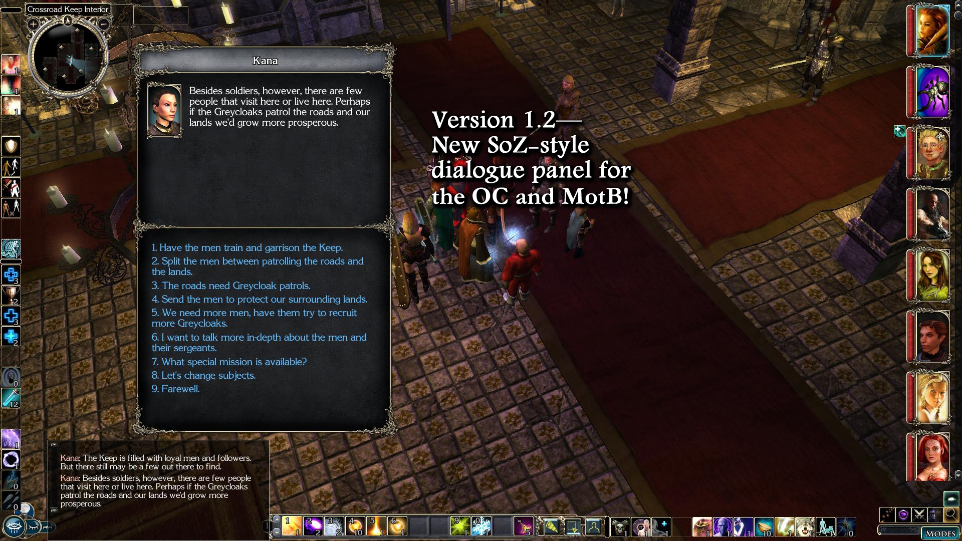 My work on this mod started as a mod for the conversation panel (what the game files call the "quick chat" panel). I prefer the dialogue to be presented in this manner, rather than the "cinematic" style that's the default in the toolset. I prefer being able to control the pace of the conversation, and not have it fed to me in line-by-line chunks.