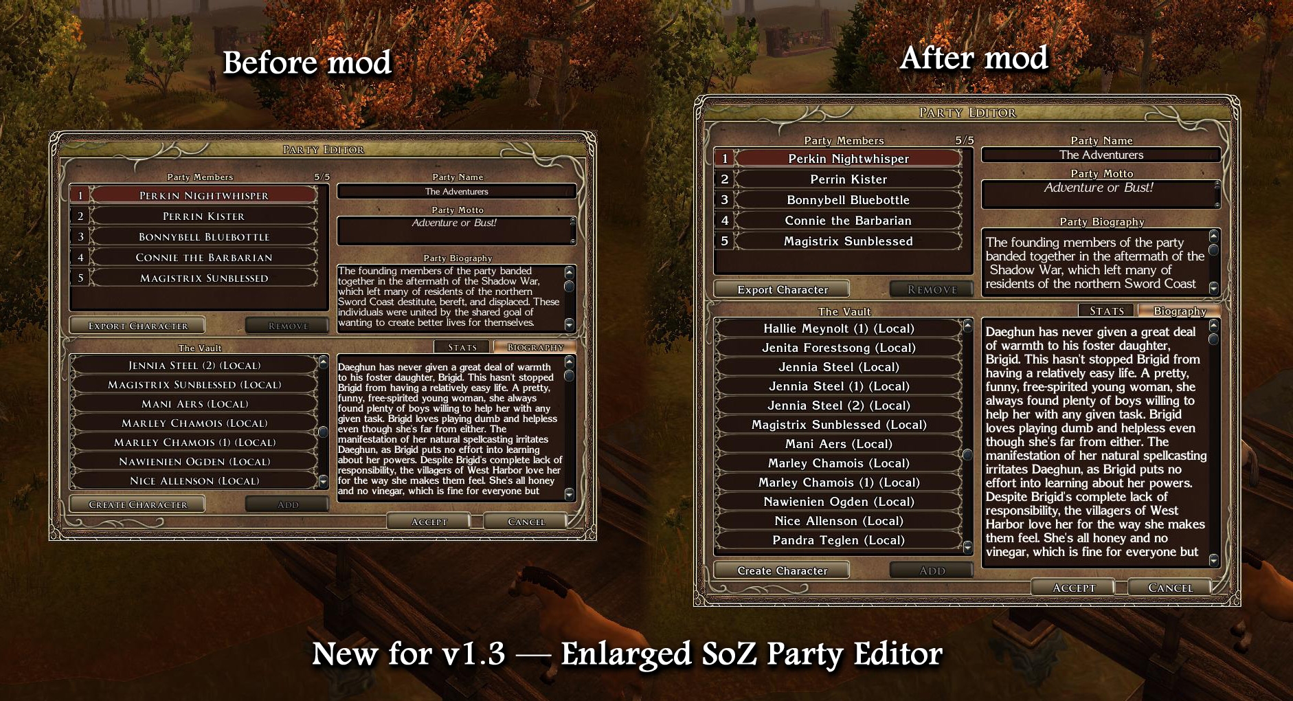 This mod overhauls many aspects of the user interface of NWN2 to provide larger fonts and larger panels for HD widescreen resolutions of 1920x1080, as well as support image portraits in the vertical rectangular size of 256x400 pixels.