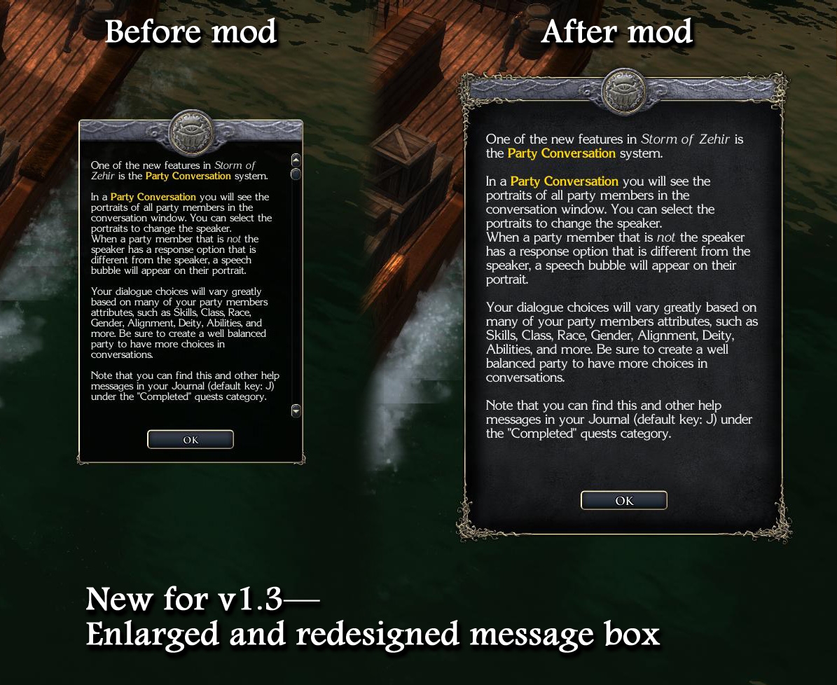 1. Summary I play at a high resolution, so I want big panels that take advantage of the large screen size, and also large fonts so it'll be readable. This mod enlarges the font and panel sizes of nearly everything in-game, making them both easier to read, and require less scrolling to see everything, and also adds support for NWN1-style portraits, in a 1:2 ratio of 256x400 pixels. Included in the package is a file that explains every change in detail, but broadly, this affects the panels for conversations, vendors/containers, quest log, examination/descriptions, spell lists, inventory, character sheet, party portrait bar, target icon, and various menus. Many instances of ALL-CAPS TEXT have also been changed to mixed-case, for easier readability.